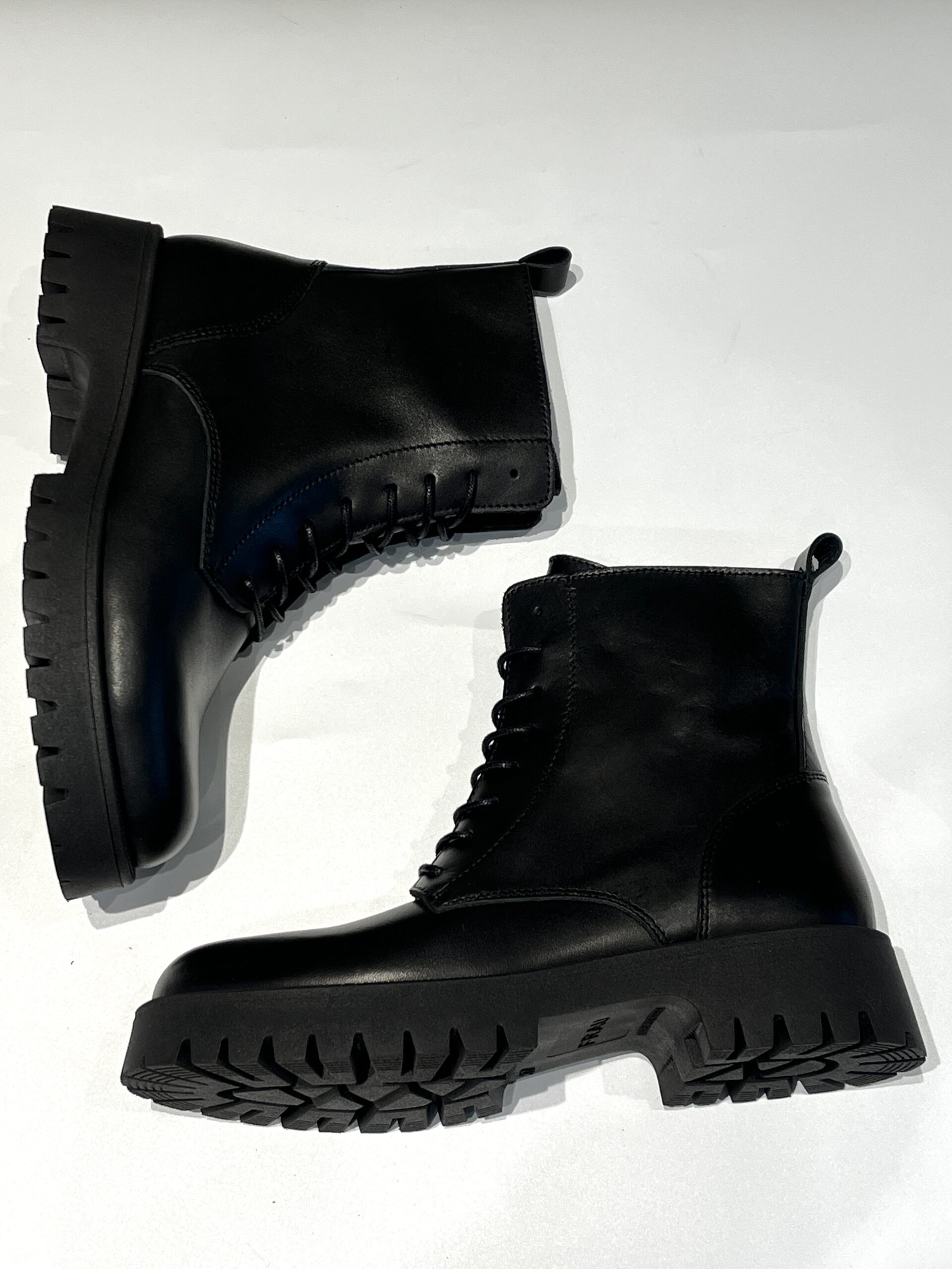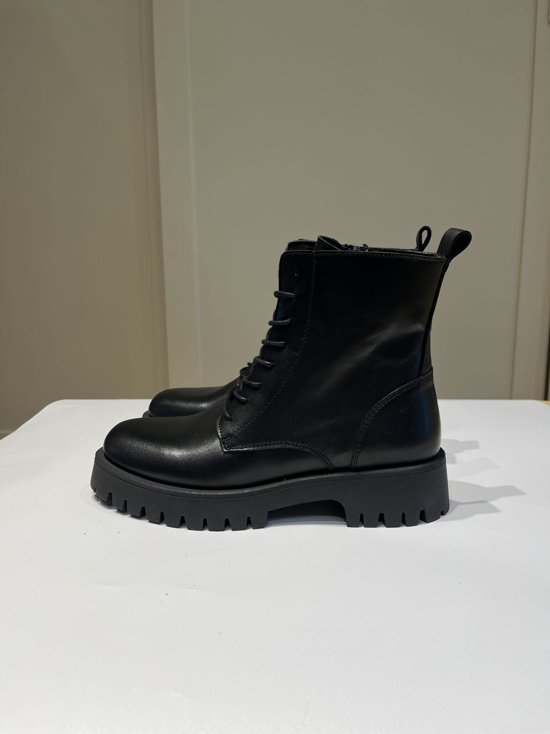 Anfibio Donna in pelle con lacci in tinta e zip laterale. Profili della zip foderati in pelle, interni foderati in morbido tessuto.