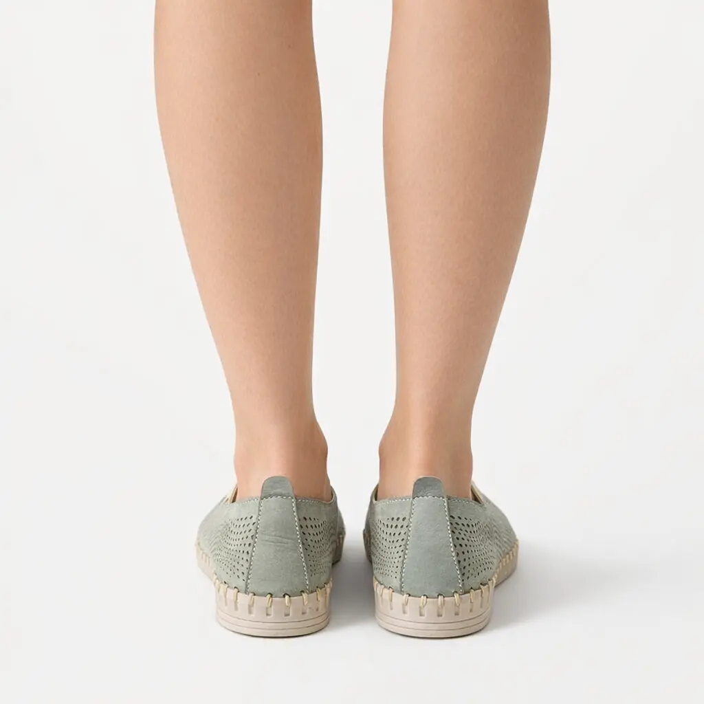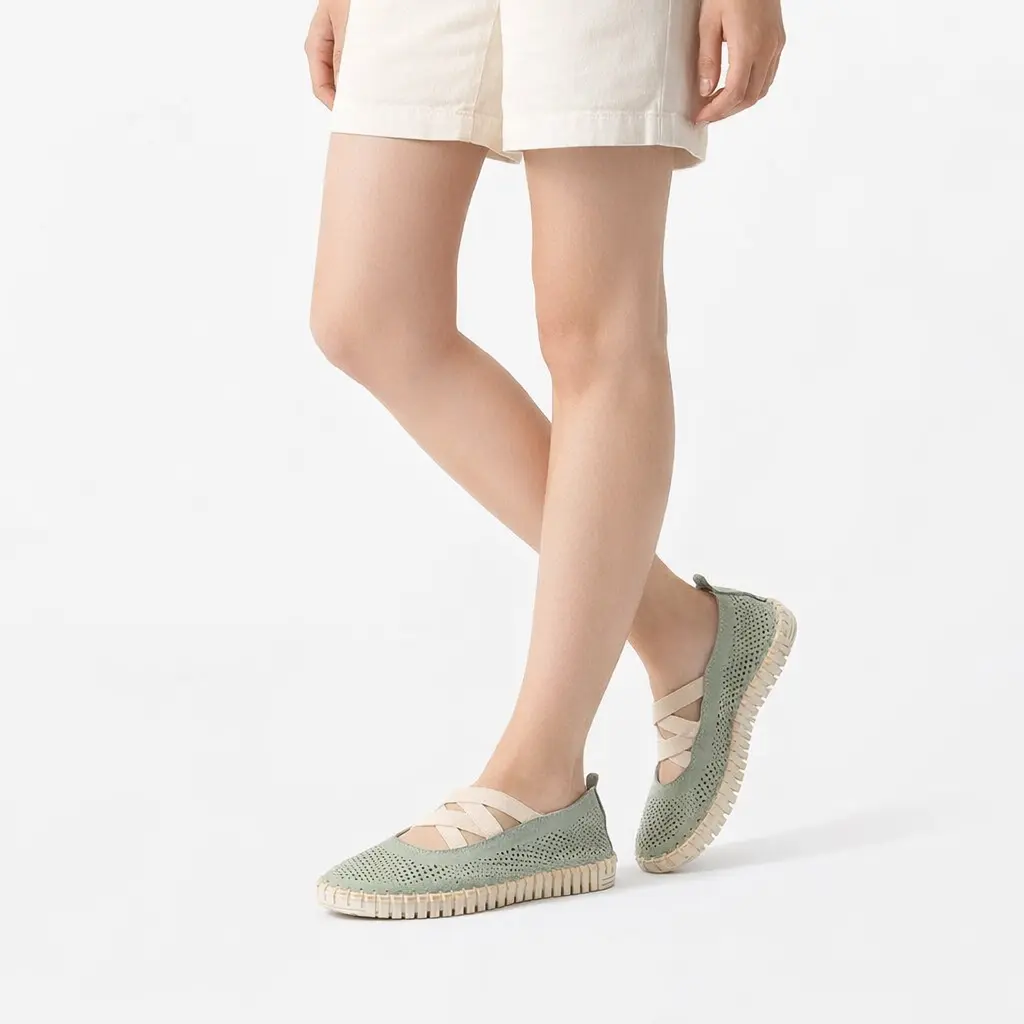 Ballerina in nabuk verde salvia con elastici intrecciati e suola in gomma super flessibile Perfette per il tempo libero o in qualsiasi occasione in cui si desideri comodità e freschezza