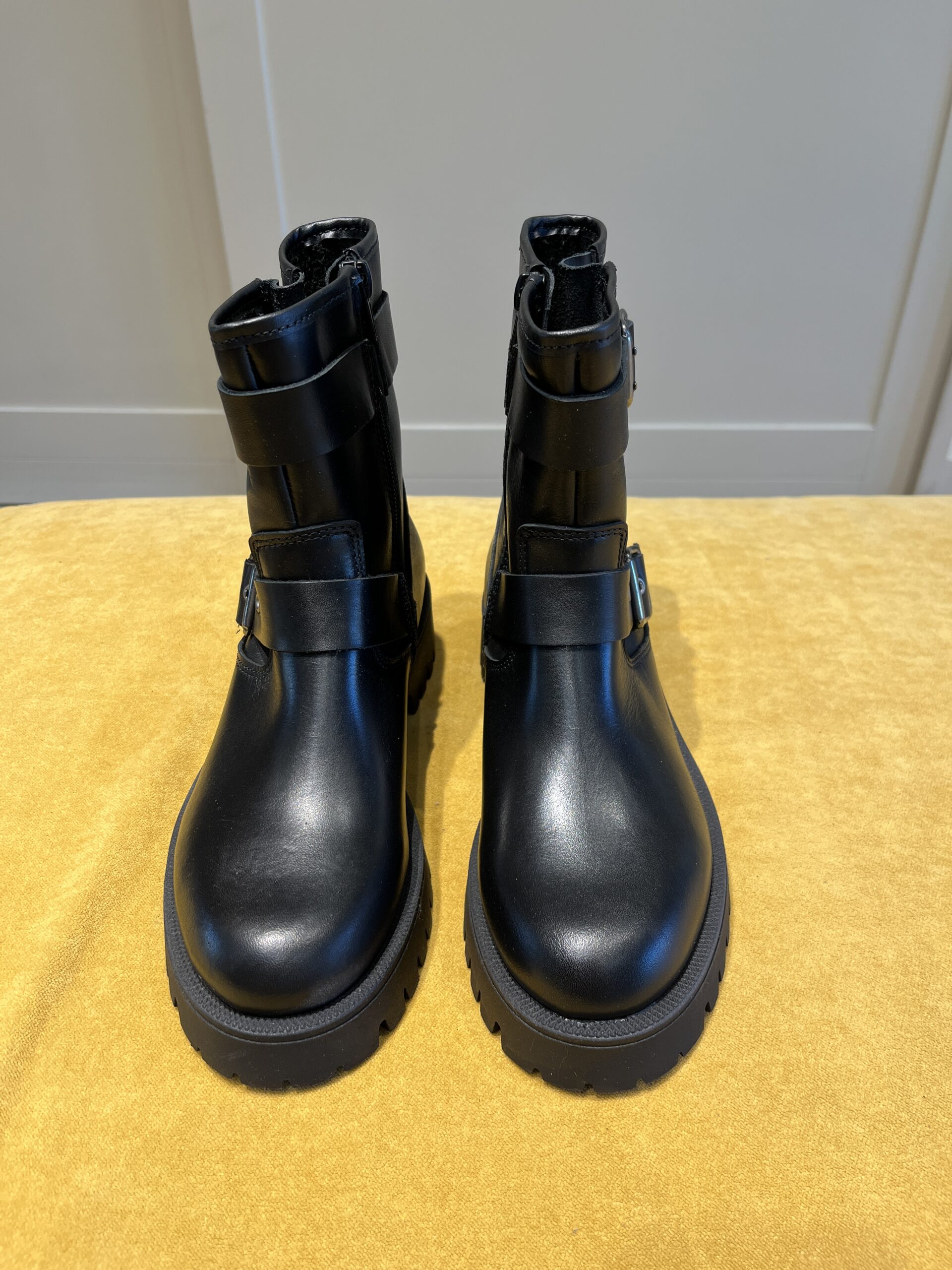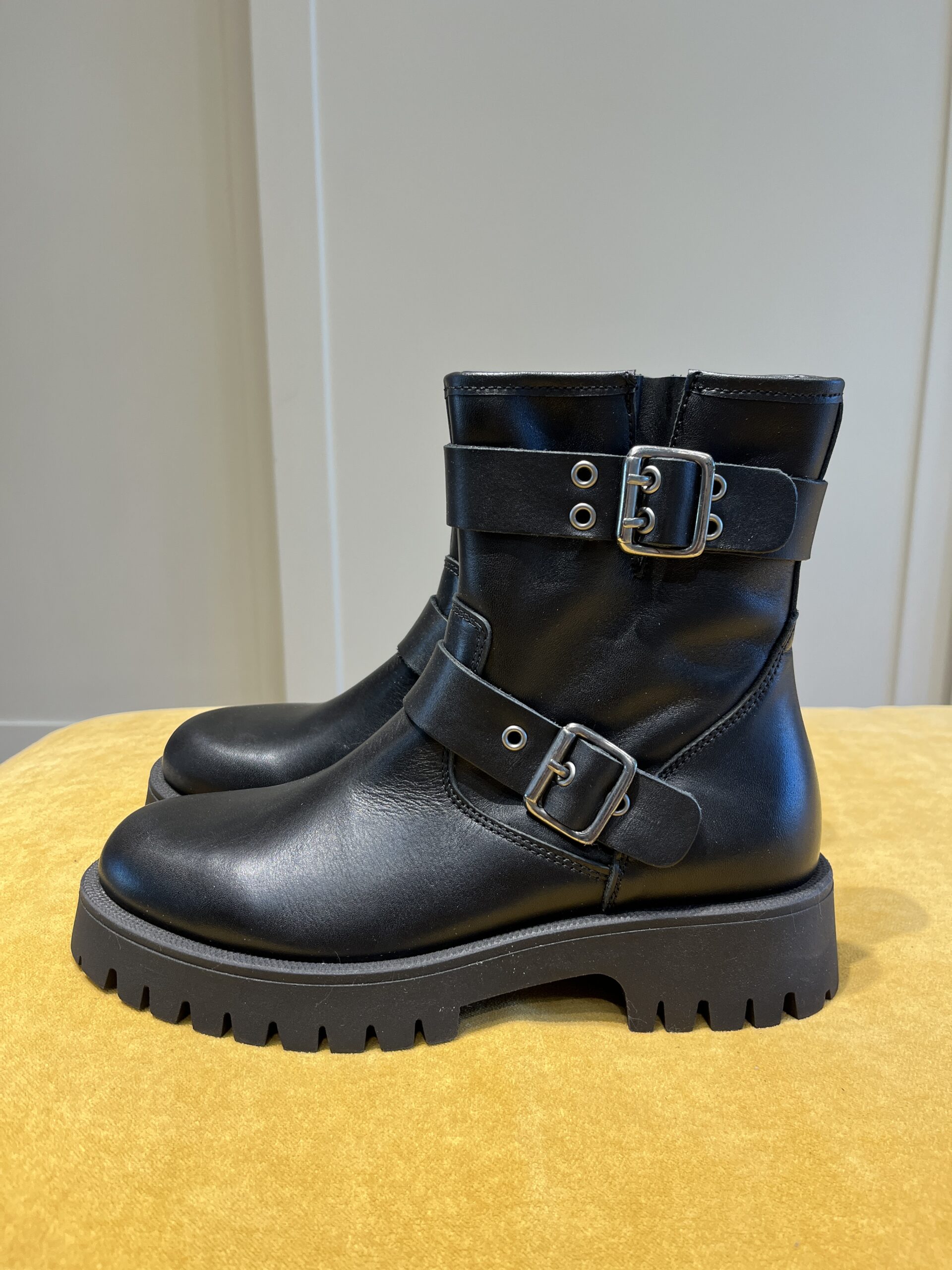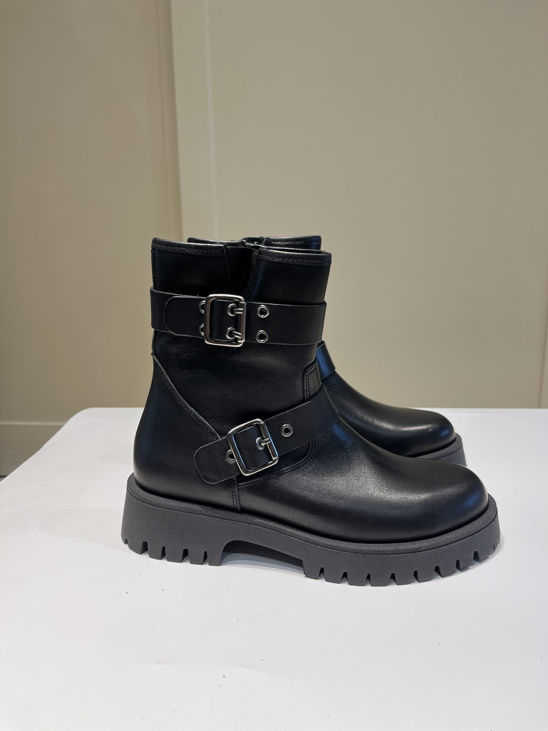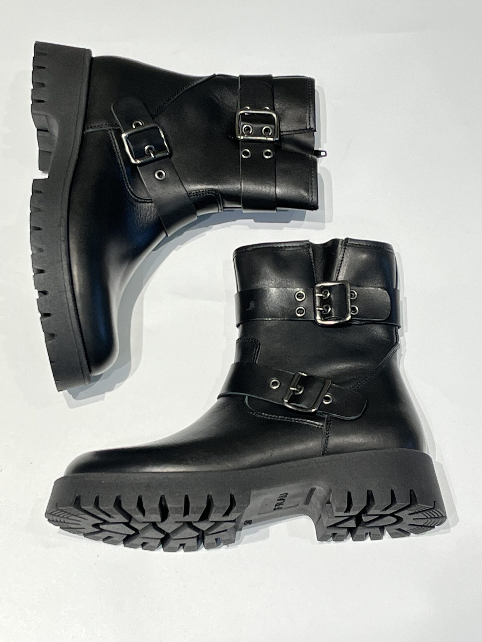Stivaletto stile “biker” in pelle nera con due fibbie laterali.