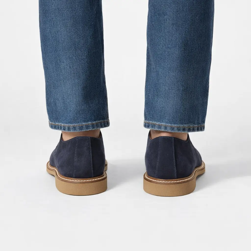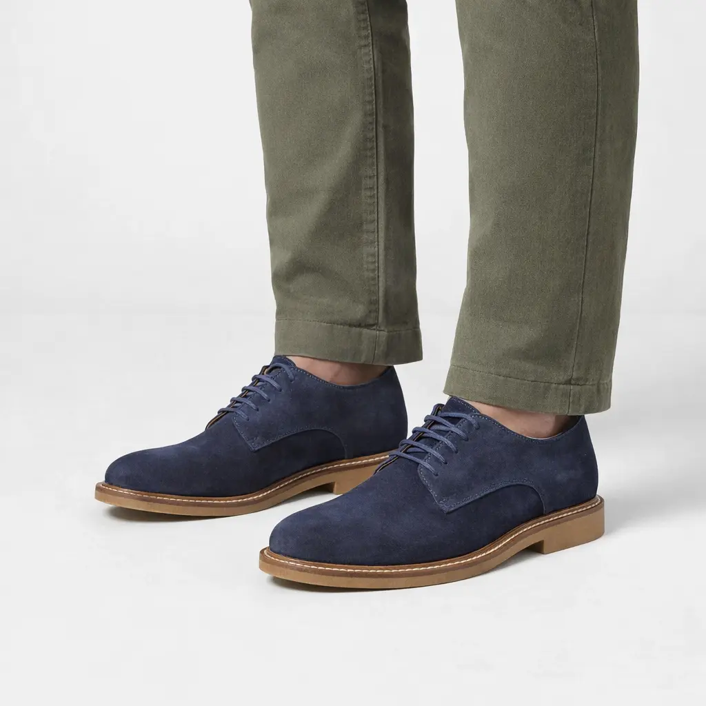 Derby uomo in pelle scamosciata blu con suola in gomma beige, ideale per un look casual chic