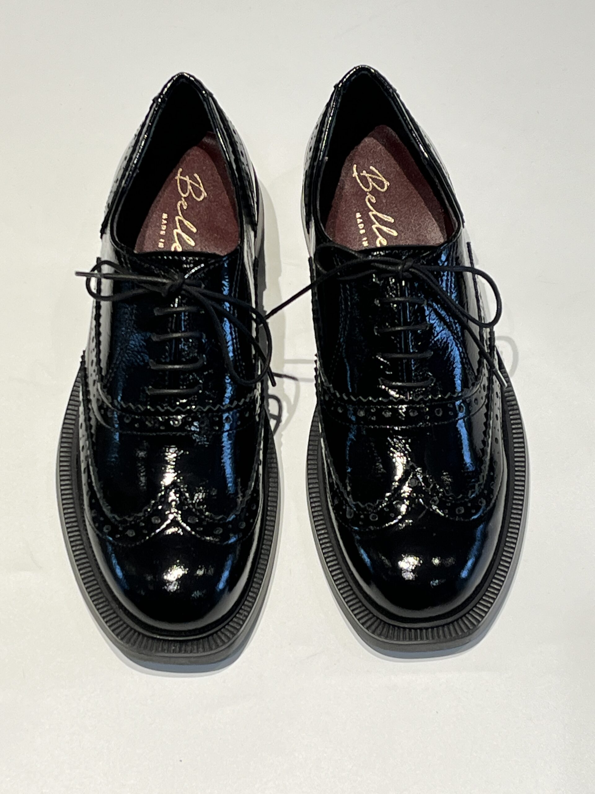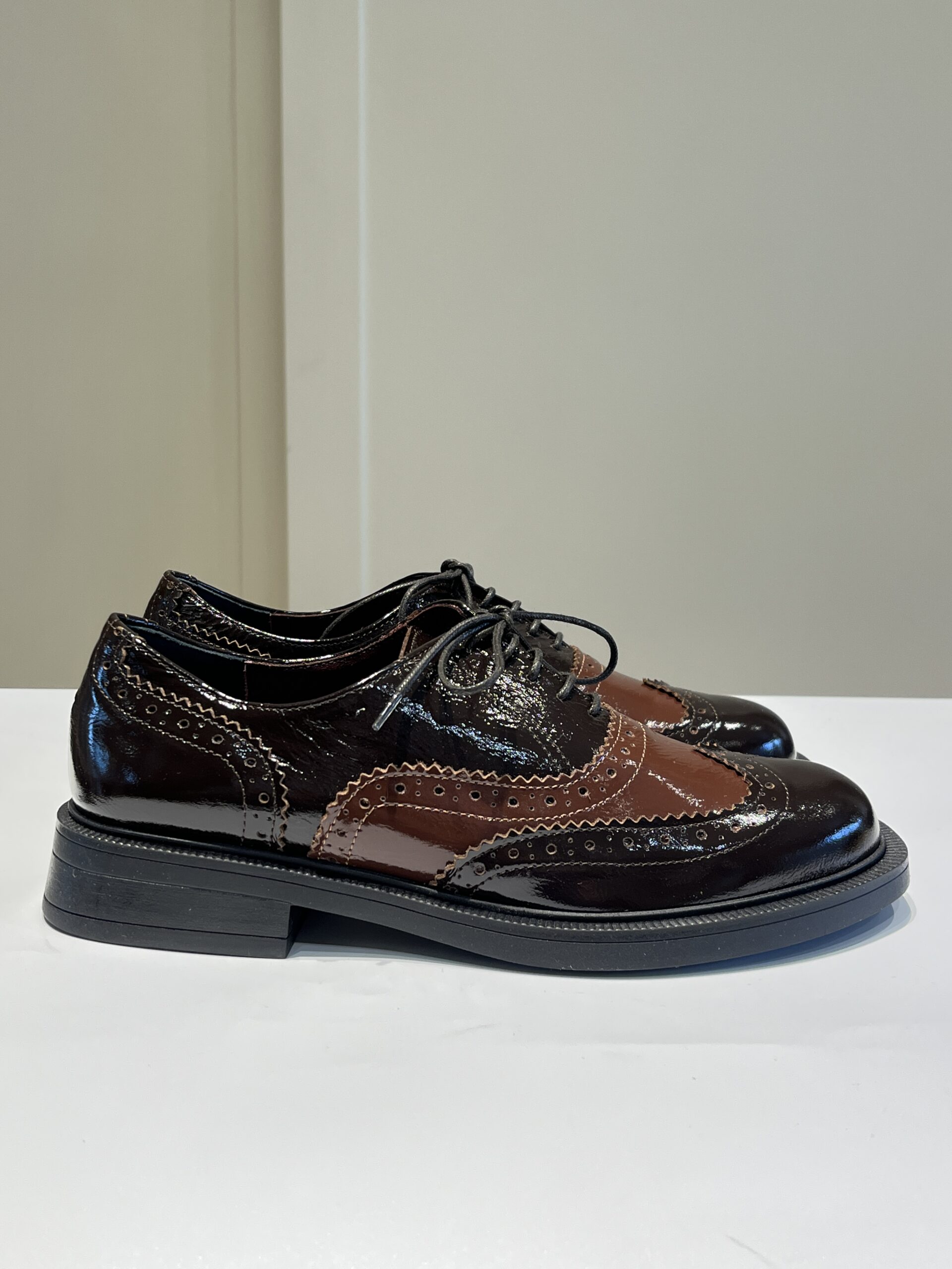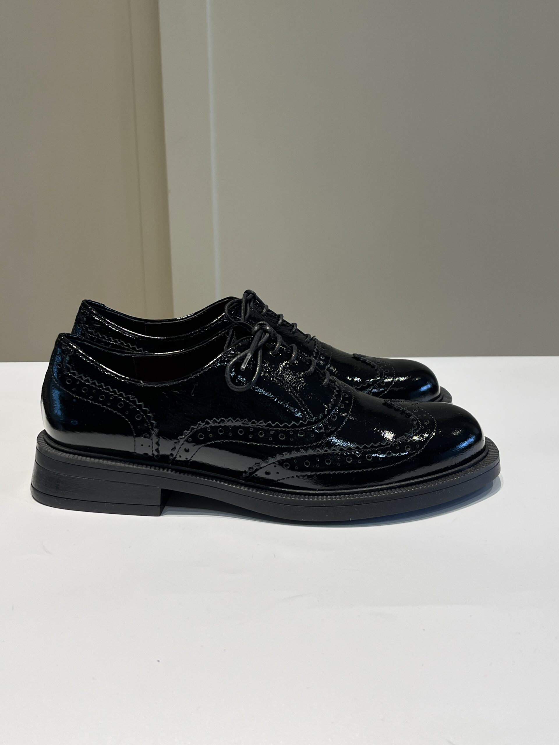 Francesina donna in vernice morbida con ricamo a coda di rondine. Suola in gomma