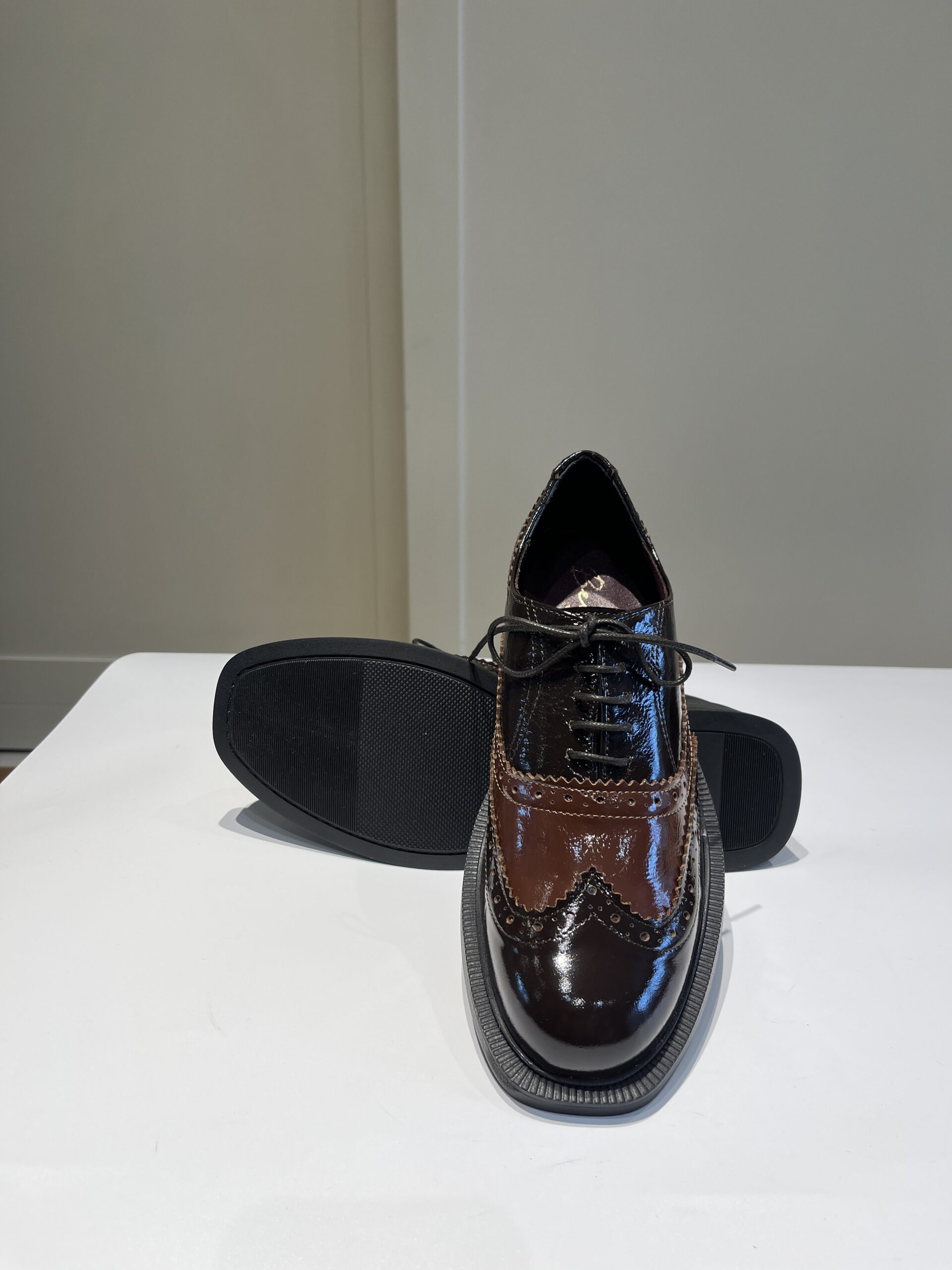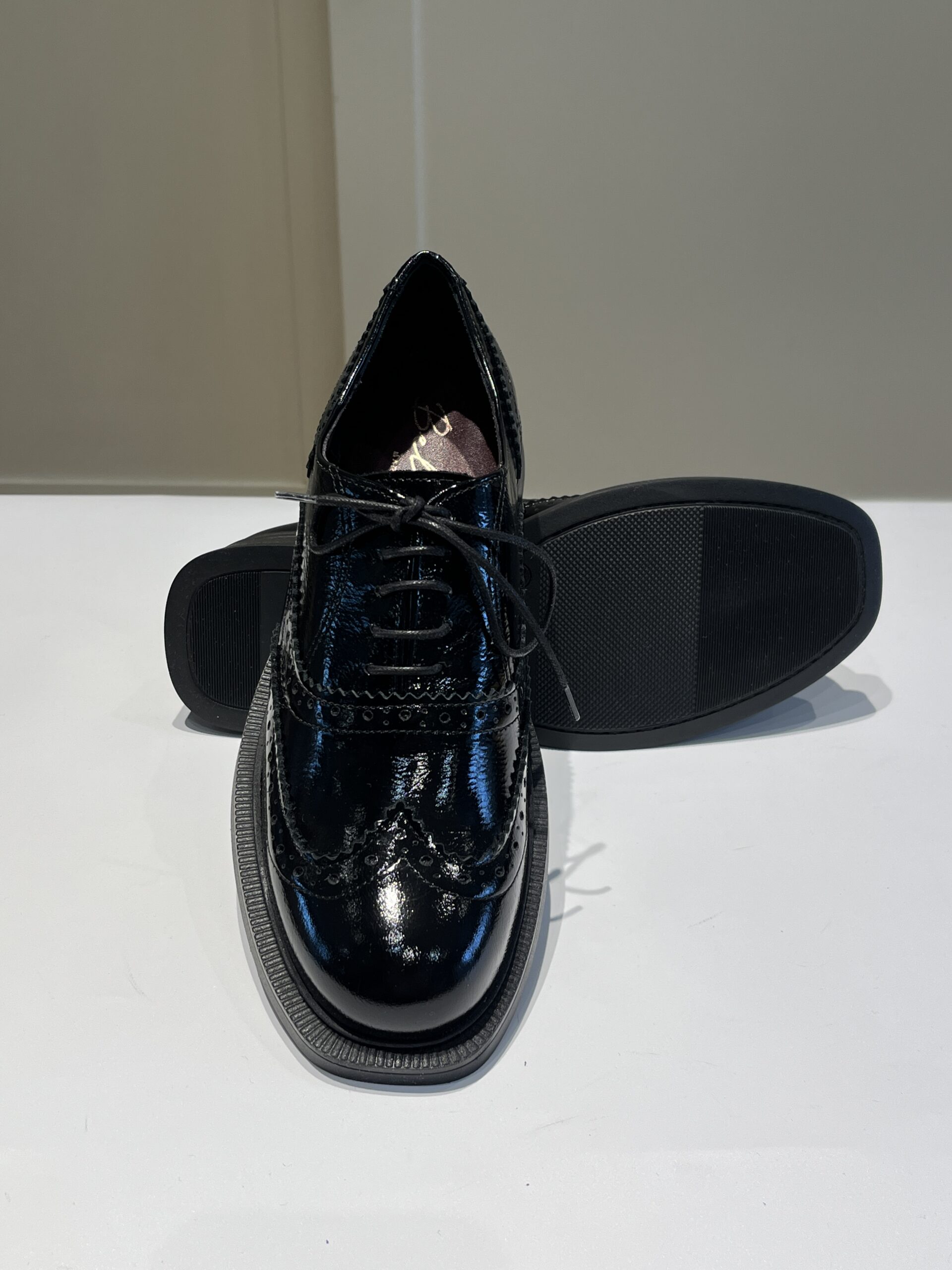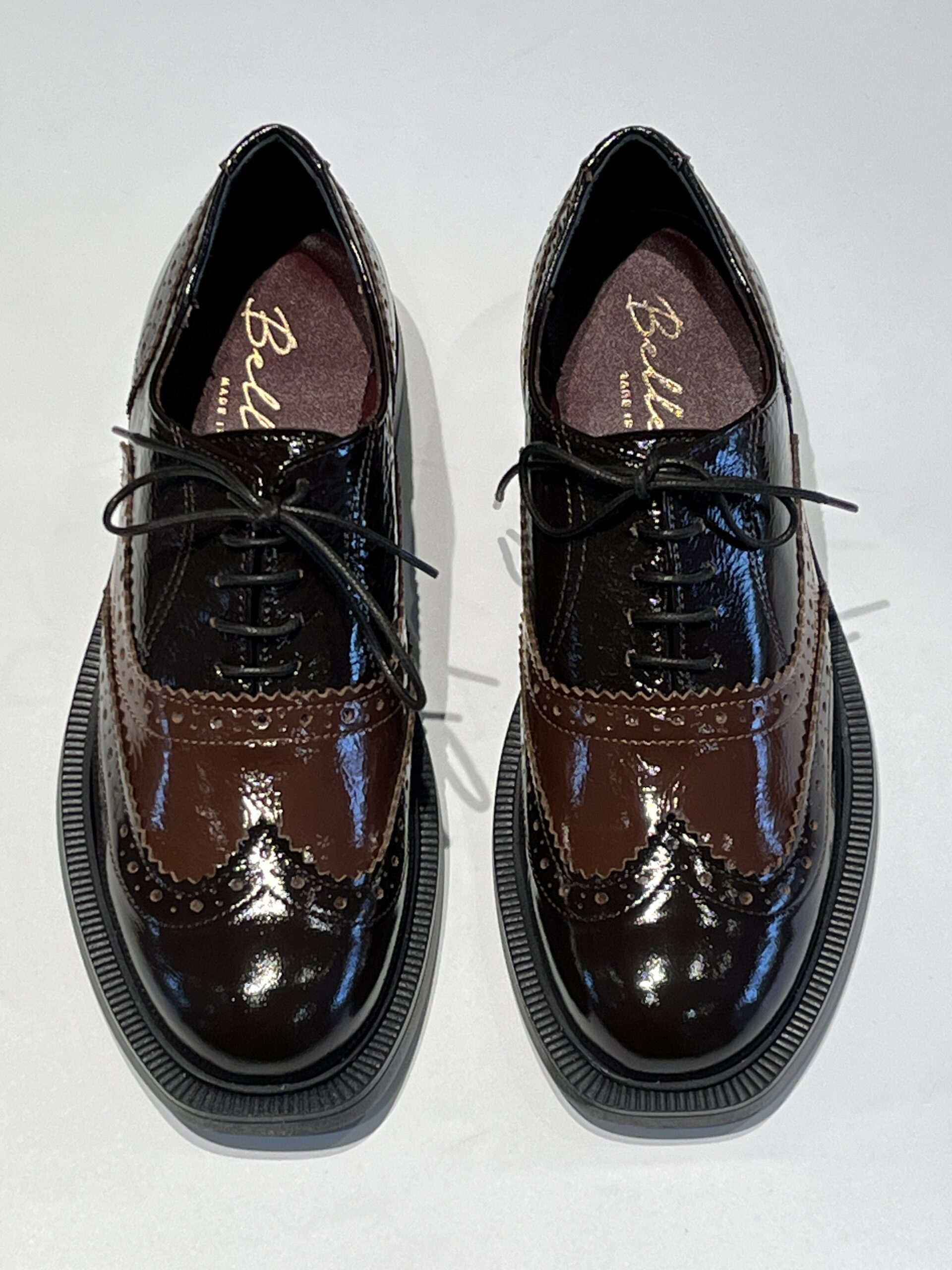 Francesina donna in vernice morbida con ricamo a coda di rondine. Suola in gomma