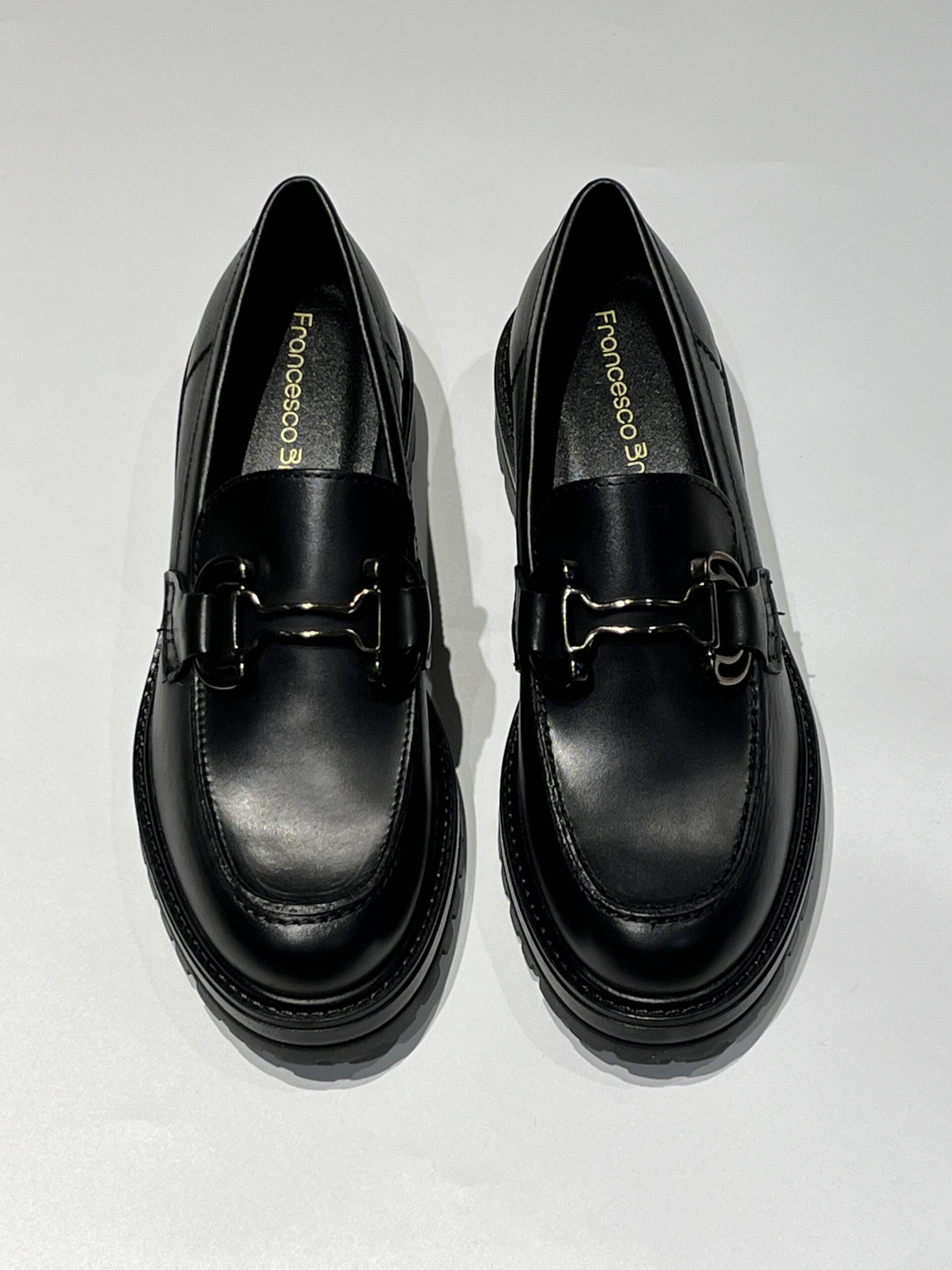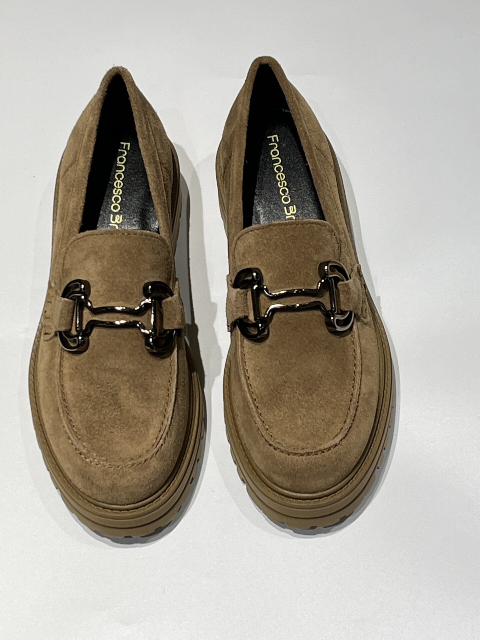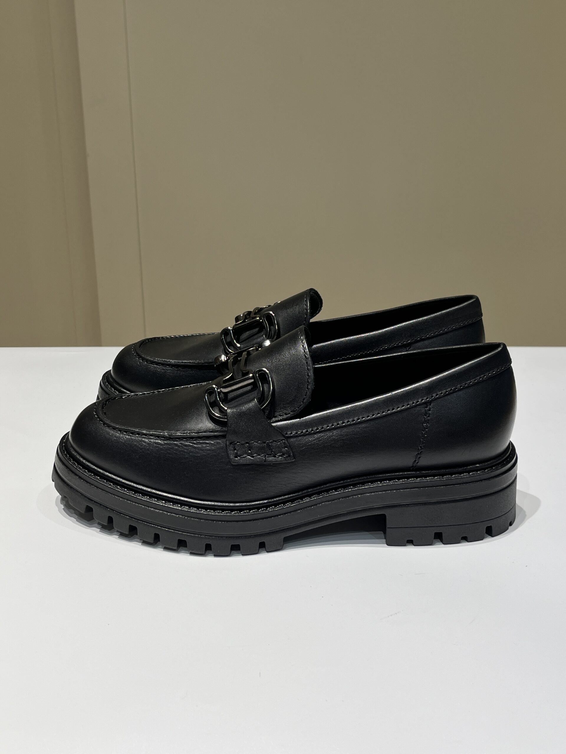 Mocassino con morsetto in metallo brunito. Suola in gomma con carrarmato.