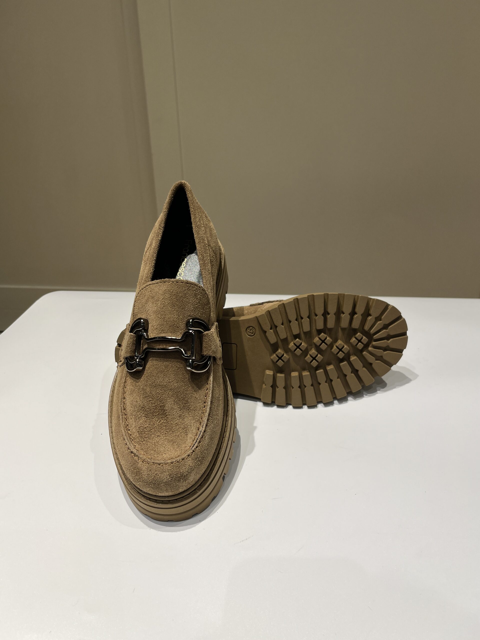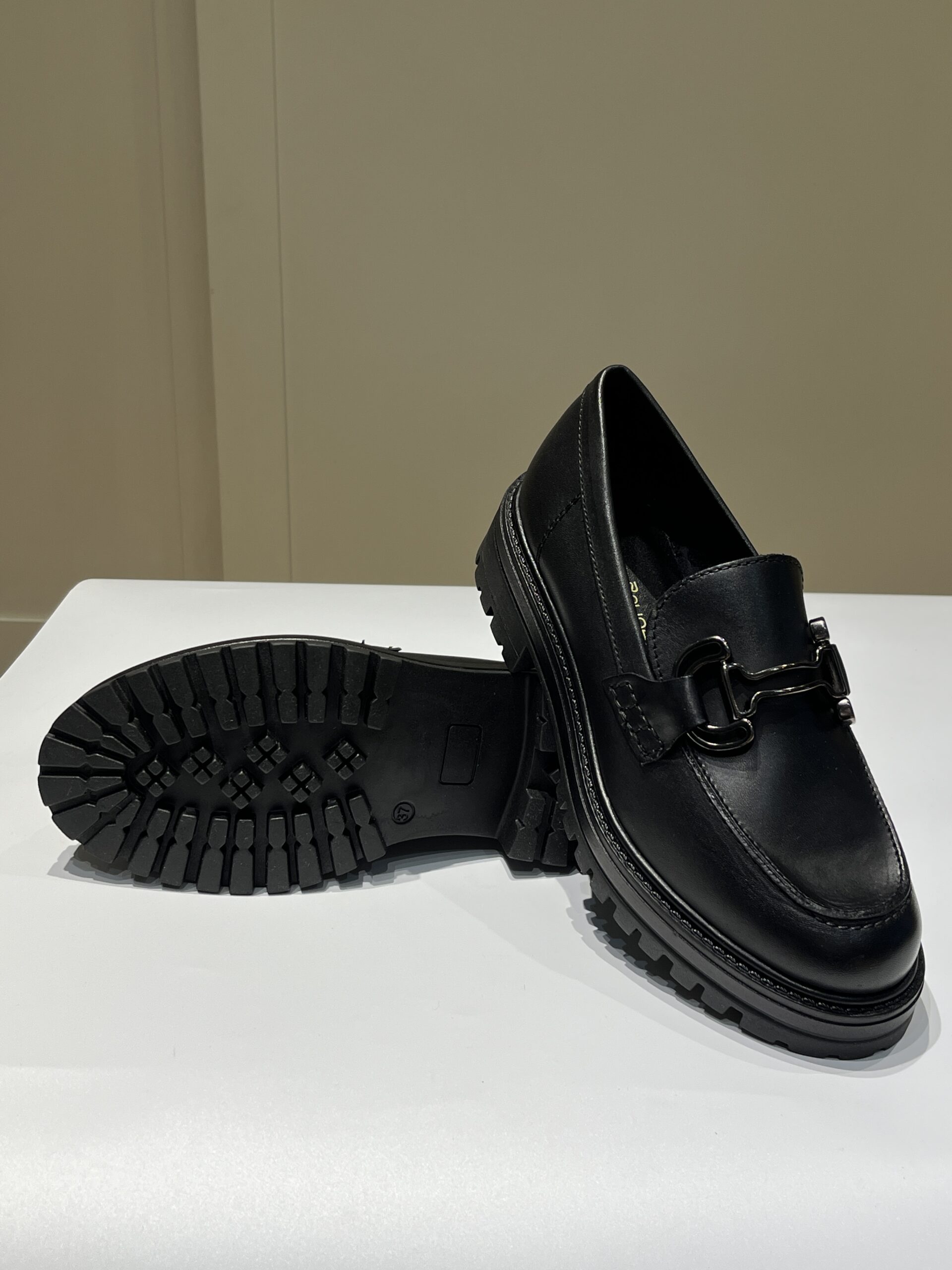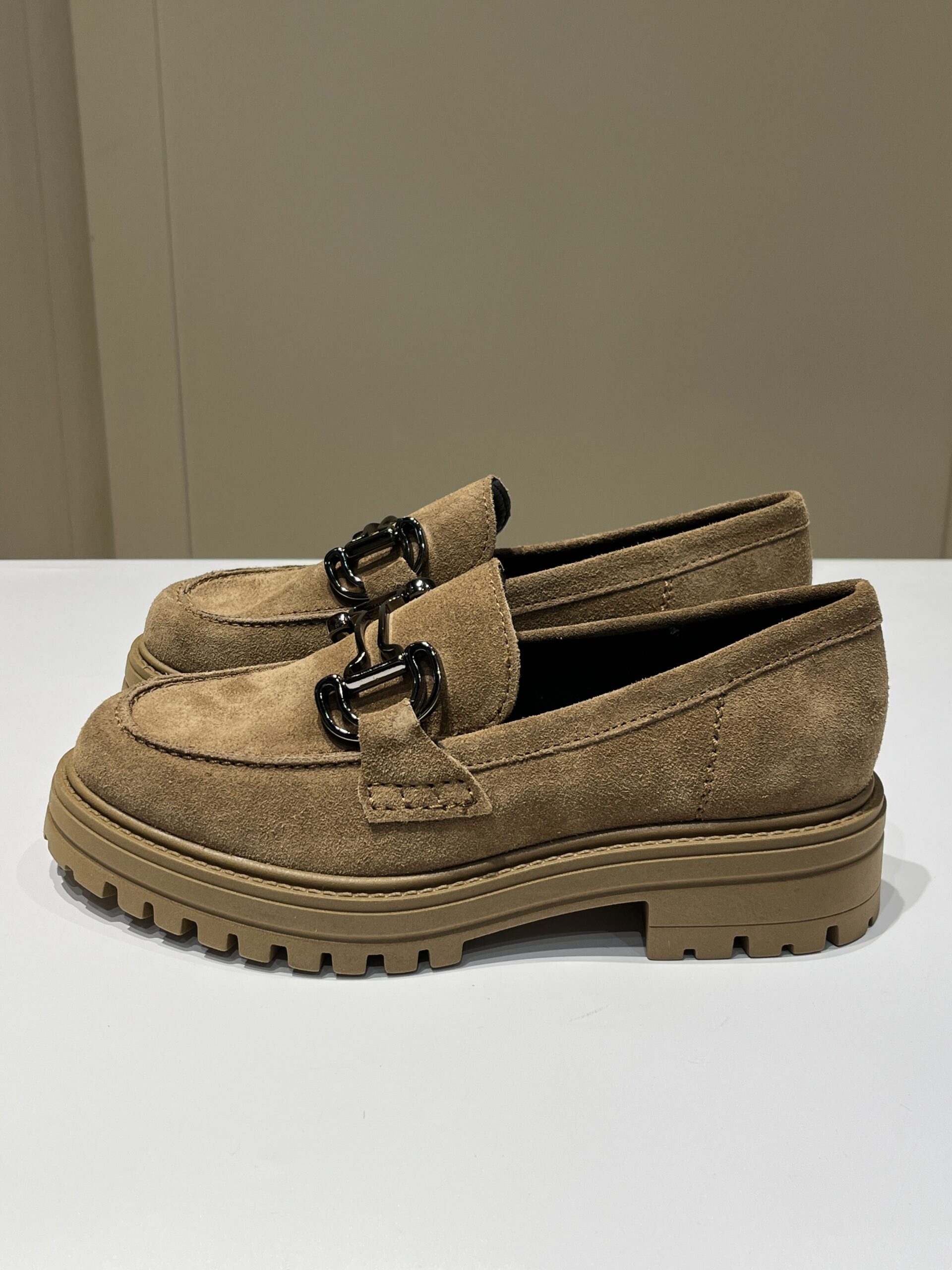 Mocassino con morsetto in metallo brunito. Suola in gomma con carrarmato.