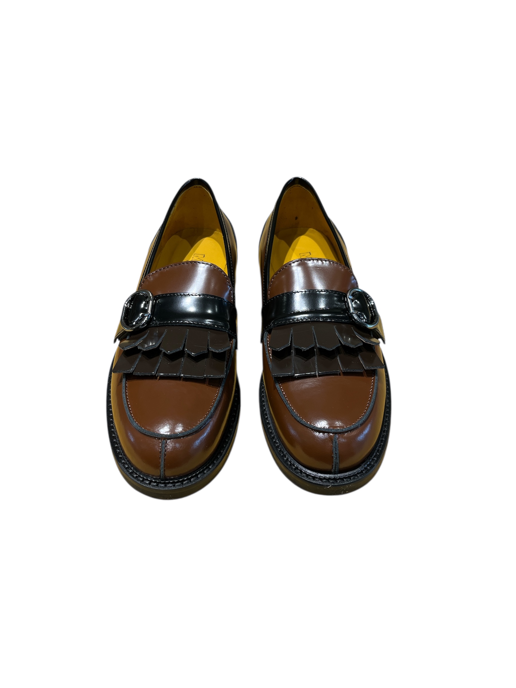 Mocassino in pelle spazzolata tricolore faggio-caffè e nero con frangia e fibbia.