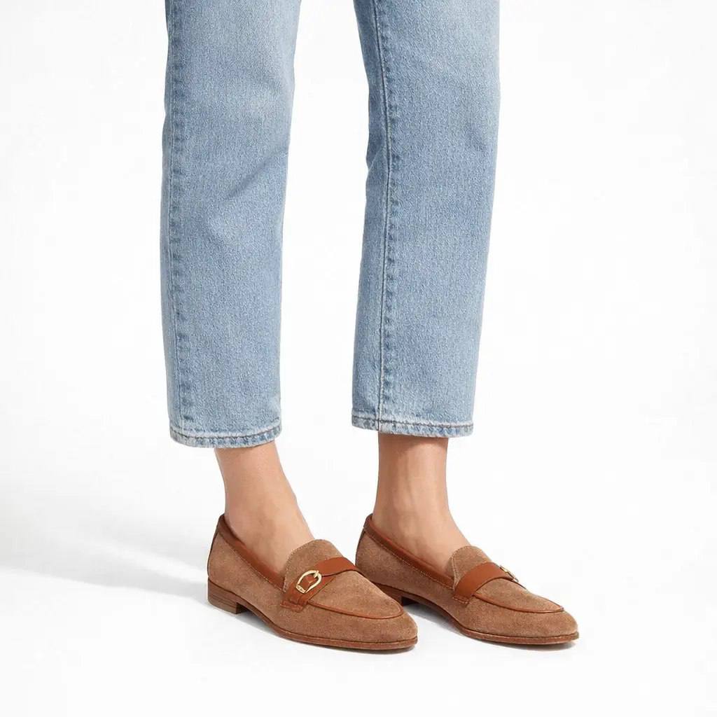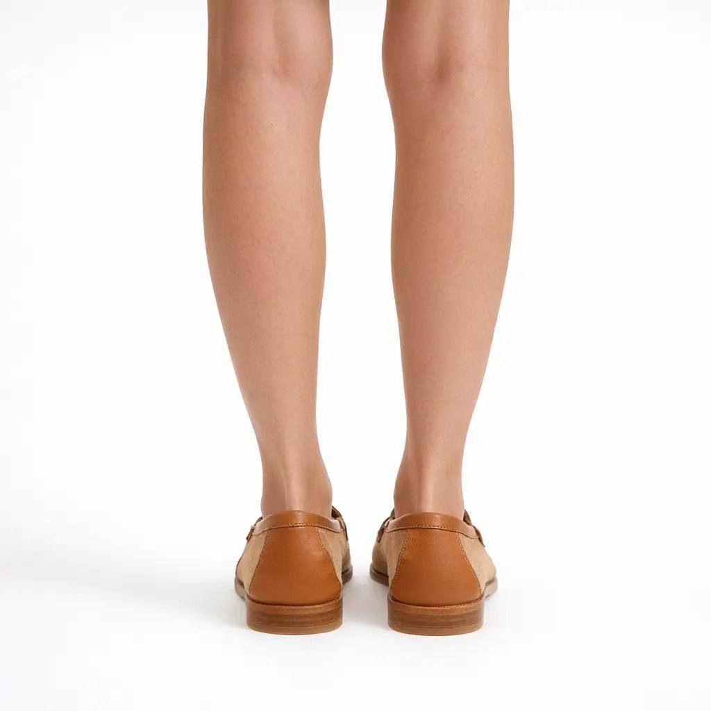 Mocassino destrutturato in pelle scamosciata color cuoio con profili in pelle tono su tono e fibbietta, perfetti per ogni occasione.