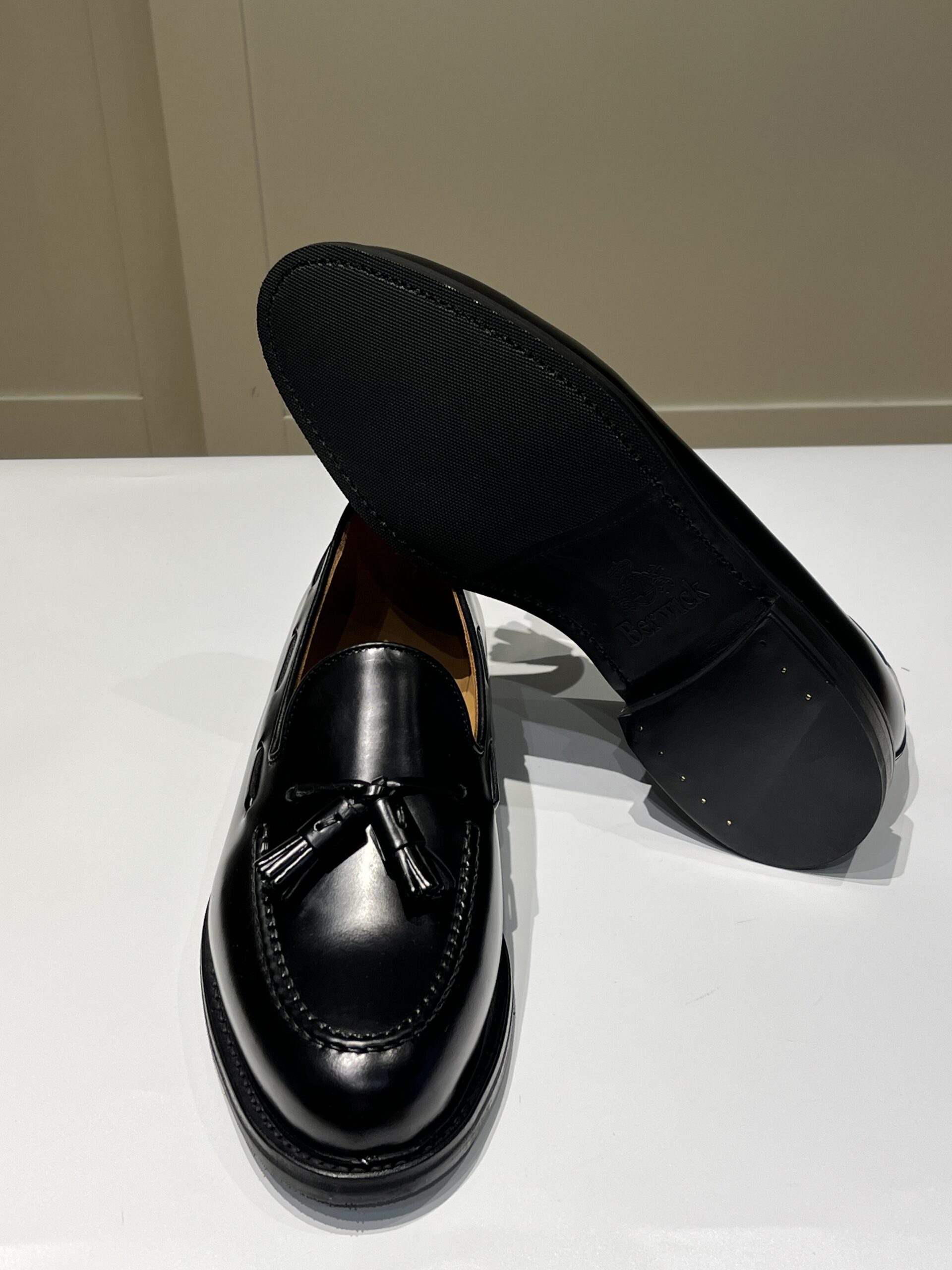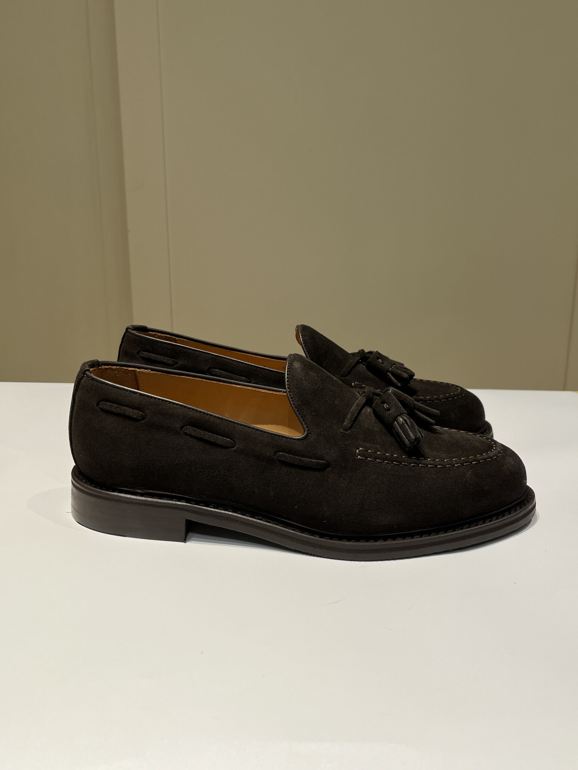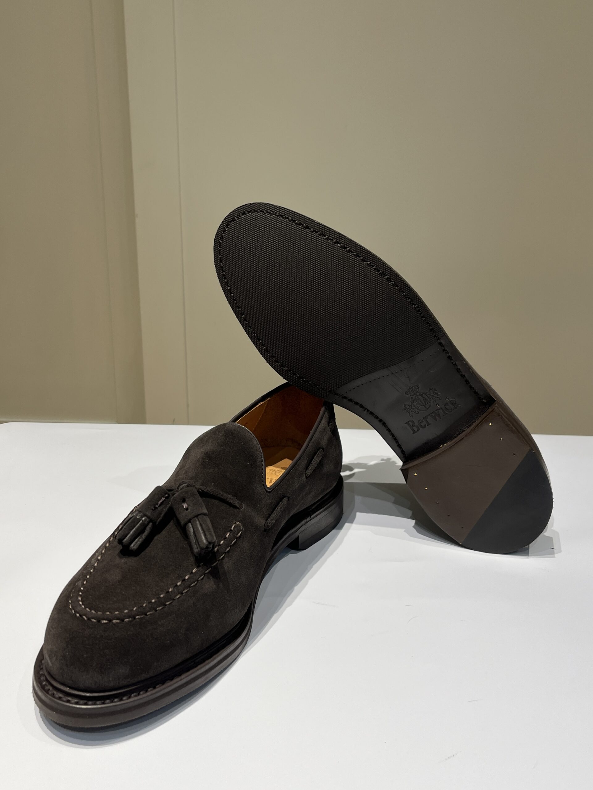 Mocassino in pelle o pelle scamosciata con nappina. Lavorazione “goodyear”. Suola in gomma