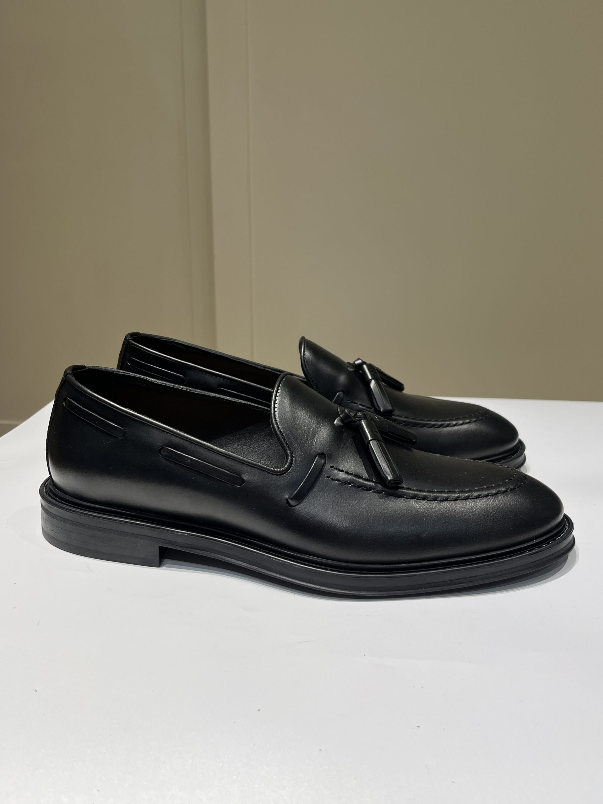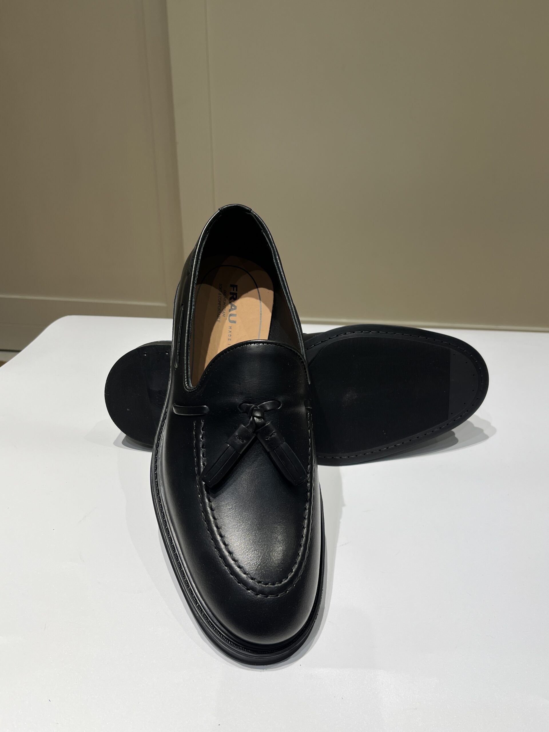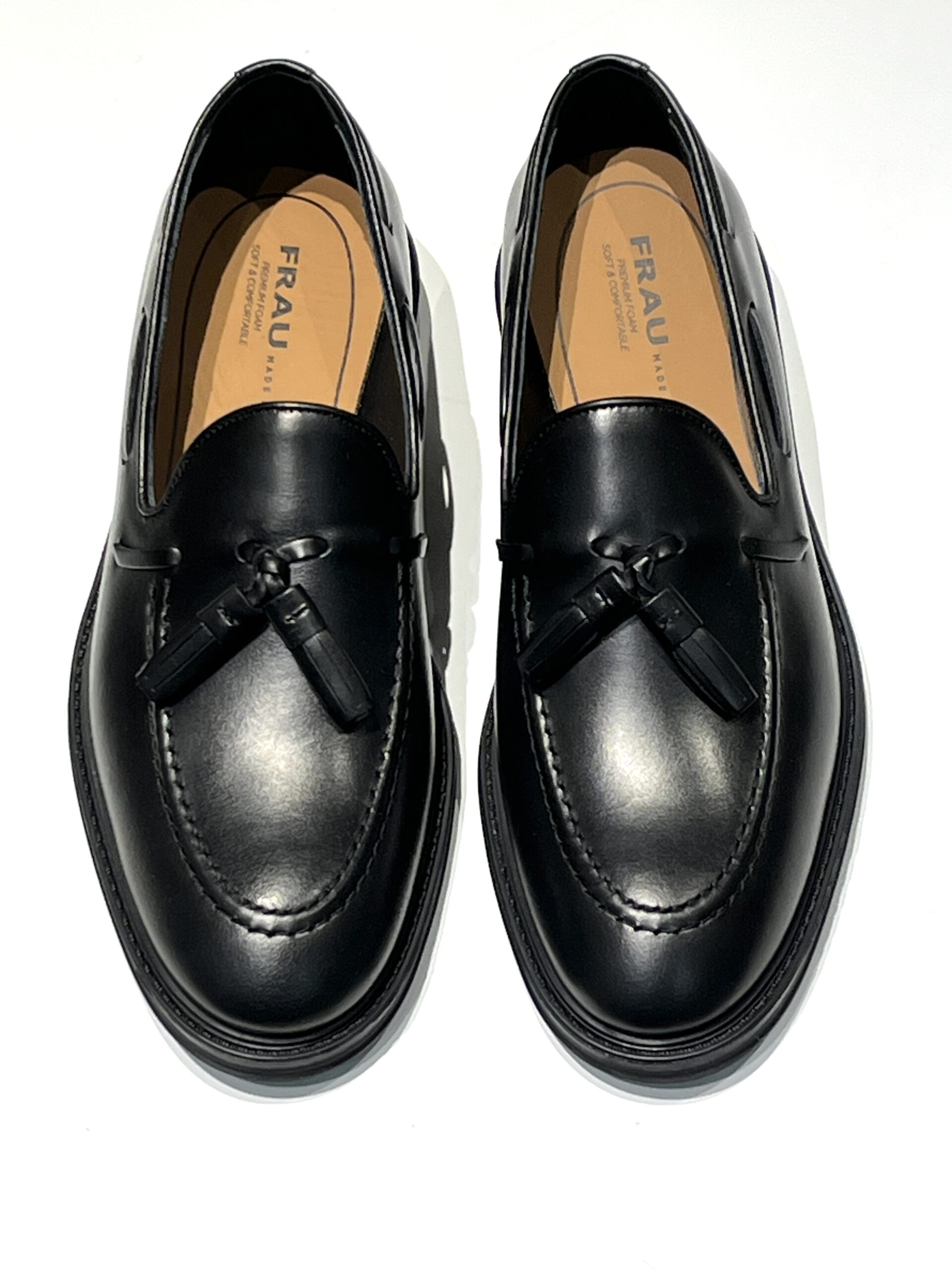 Mocassino uomo in pelle nera lucida con forma sfilata e nappine realizzate a mano. Fodera interna interamente in pelle e morbido sottopiede estraibile foderato in pelle