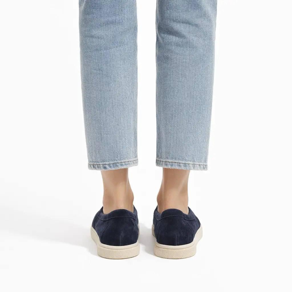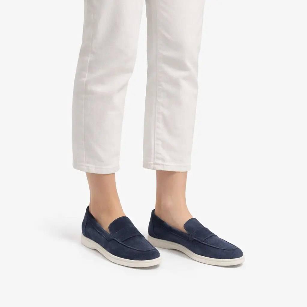 Scopri il comfort dei mocassini in camoscio destrutturato blu con suola in gomma bianca.
