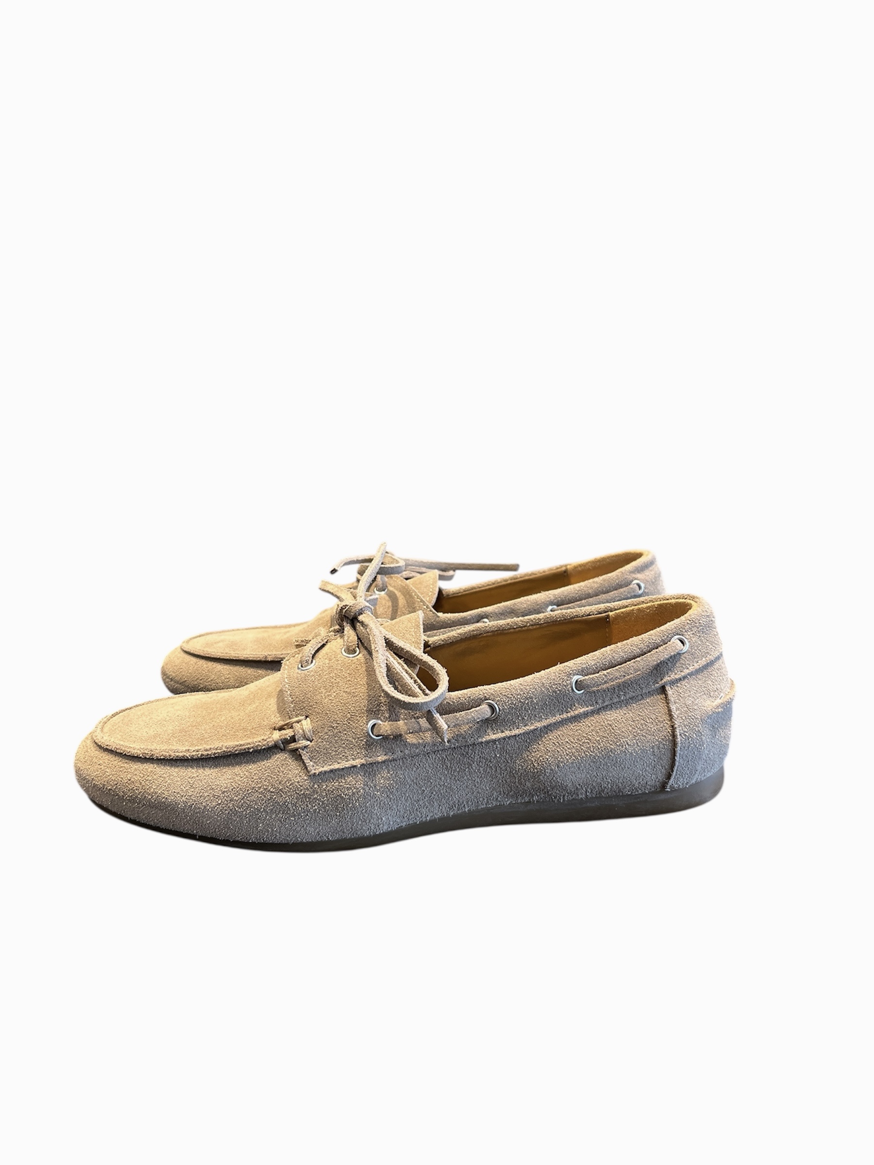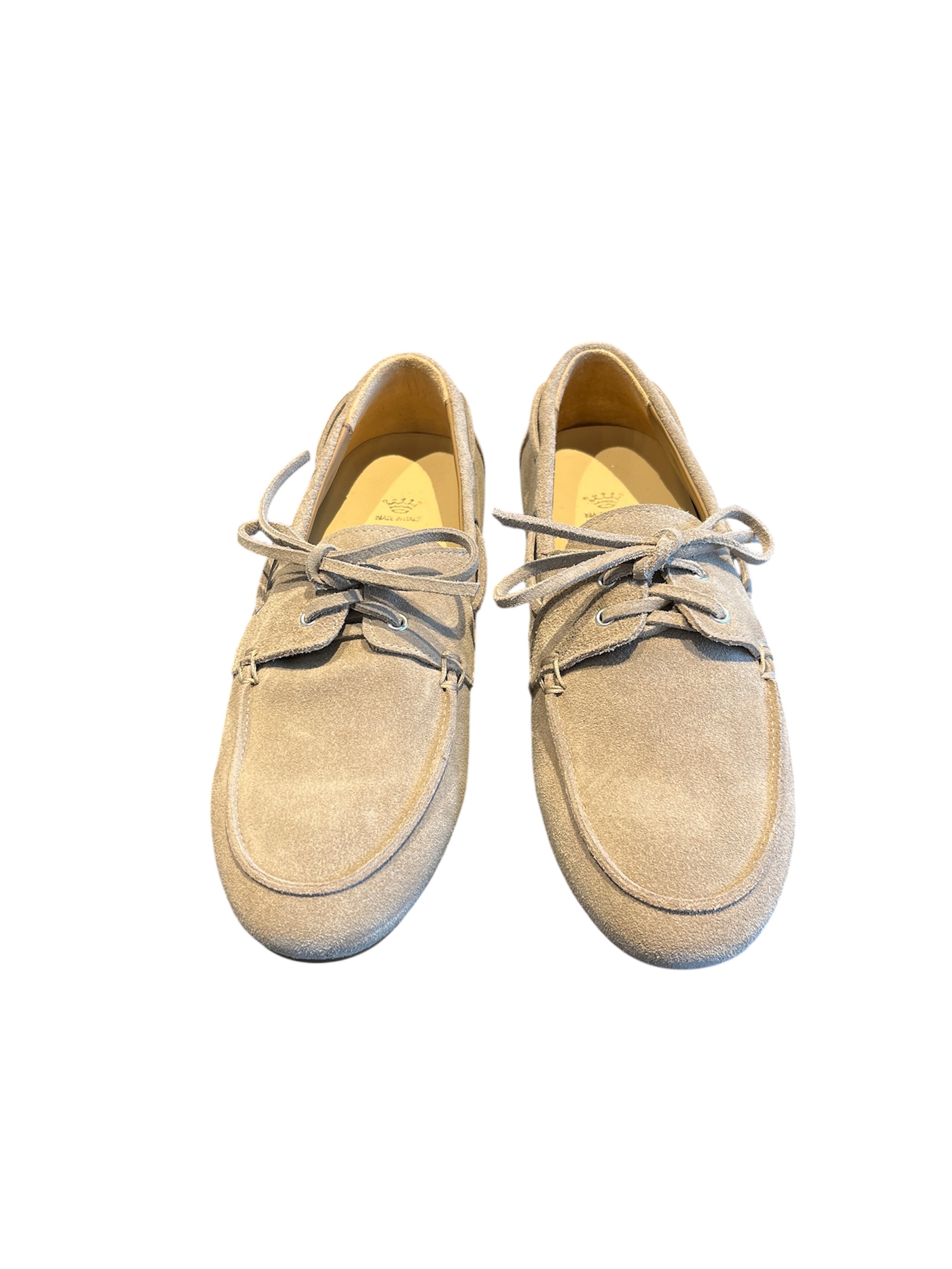 Mocassino tipo vela in camoscio color sabbia. Suola in gomma
