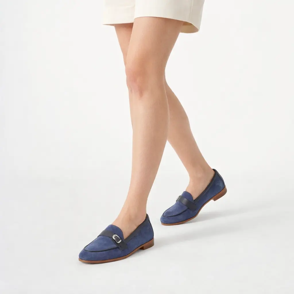 Mocassino destrutturato in pelle scamosciata blu con profili in pelle tono su tono e fibbietta, perfetti per ogni occasione.