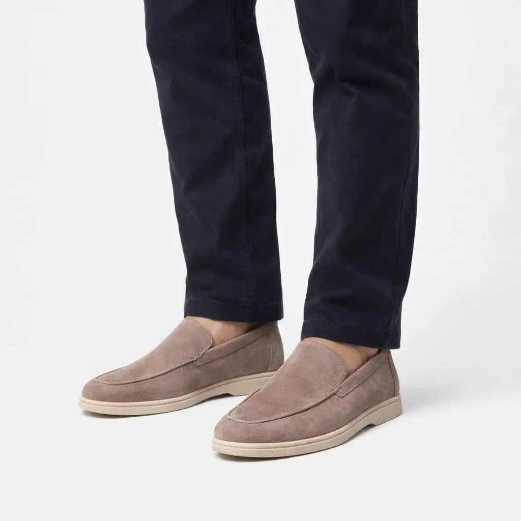 Slip-on eleganti da uomo in morbido camoscio sabbia, perfetti per ogni occasione. La suola in gomma offre comfort e stabilità.