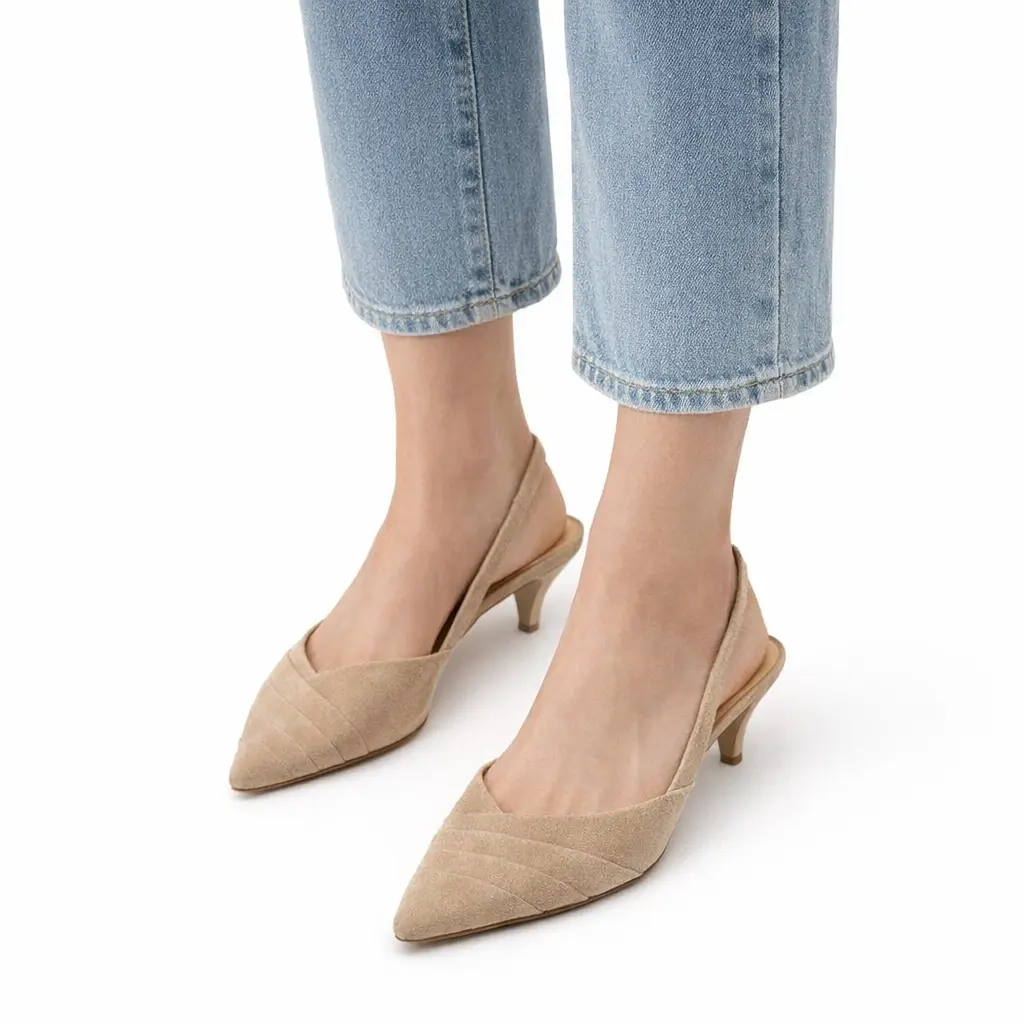 Eleganti slingback con forma sfilata in camoscio color corda con effetto plissé, con tacco 5 cm a rocchetto. Ideali per ogni occasione e dal design raffinato.