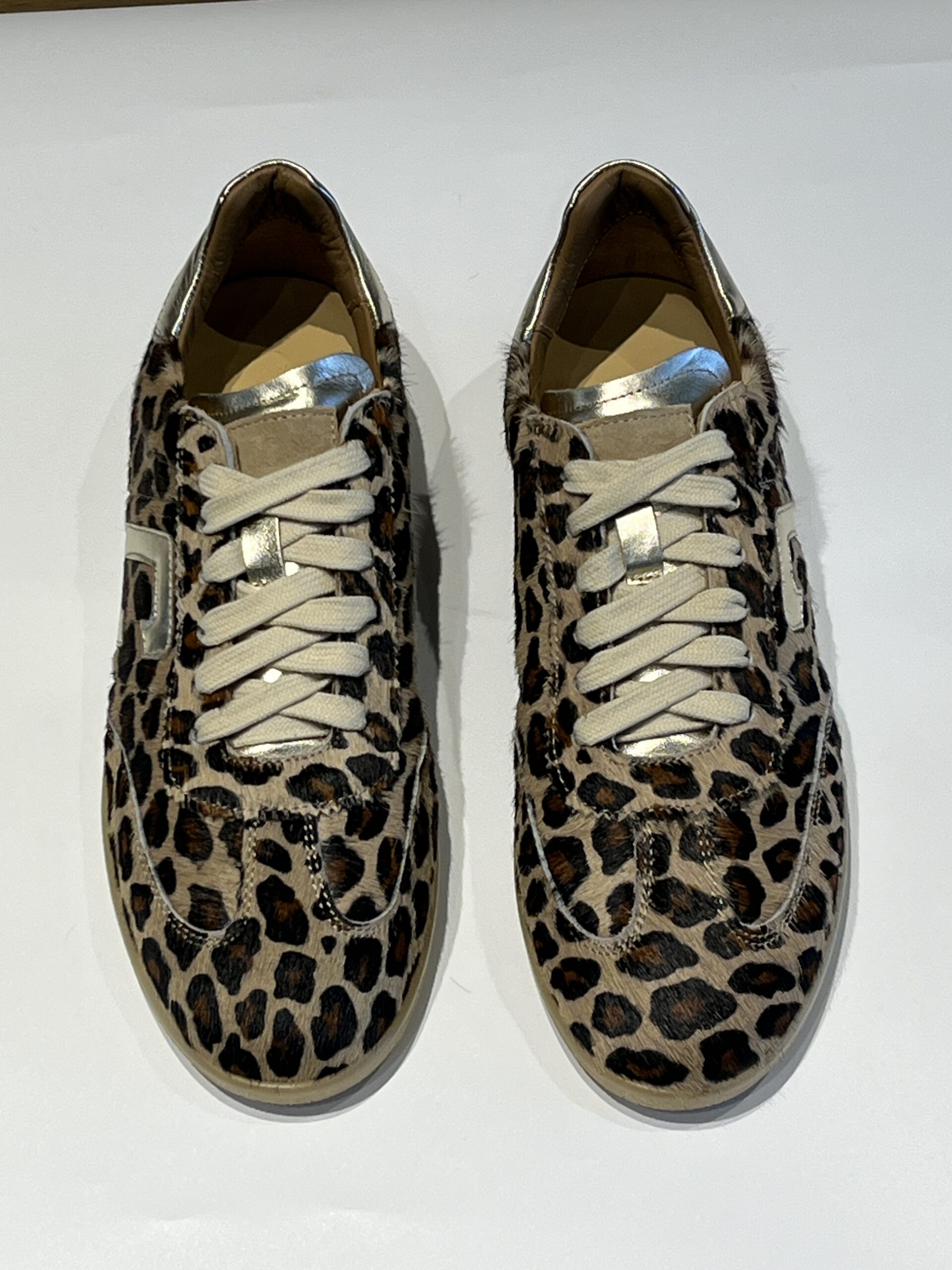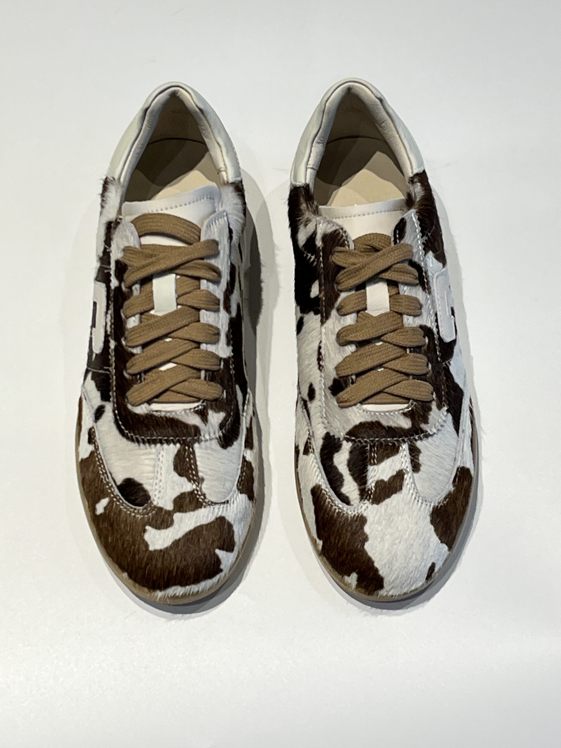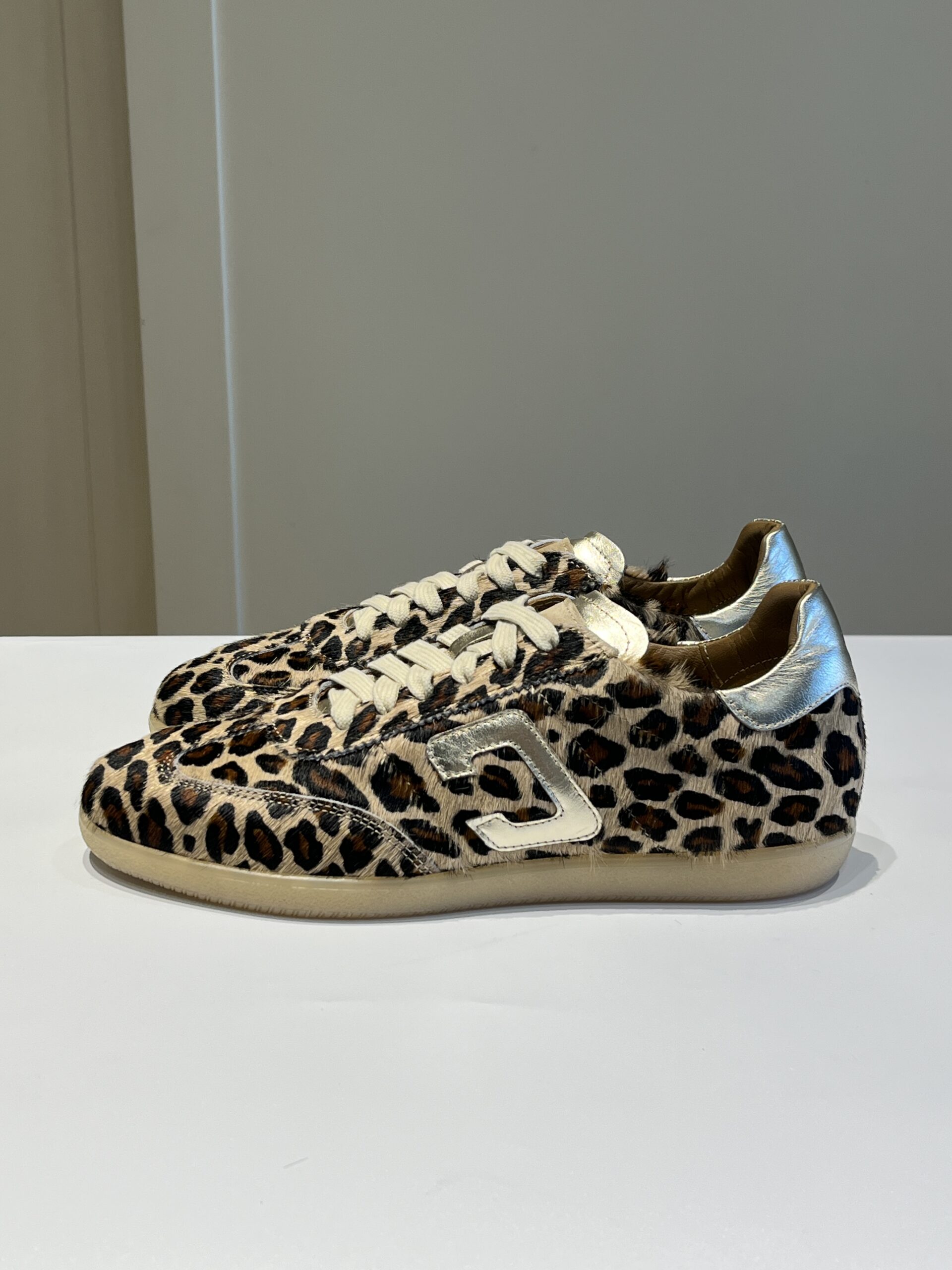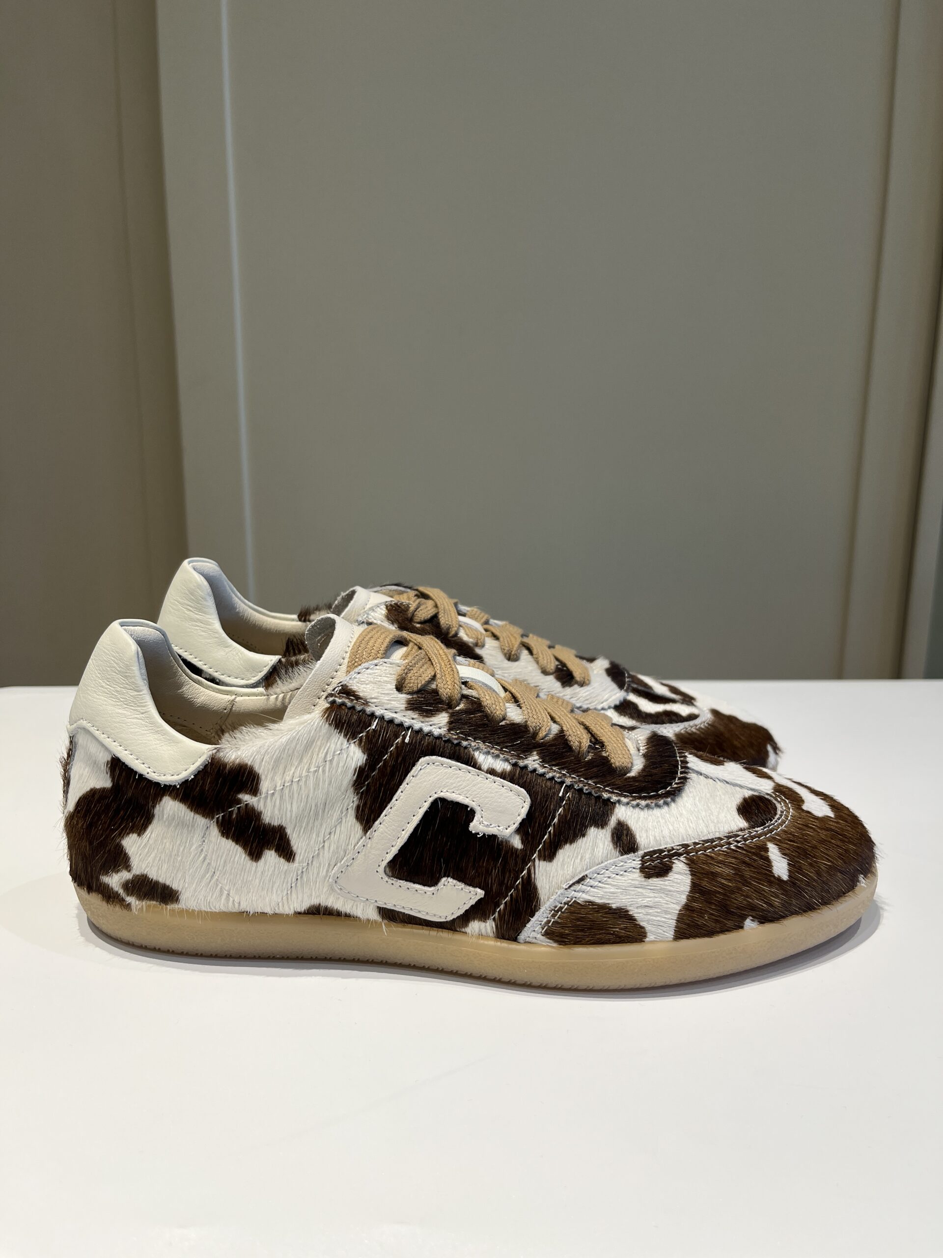 Sneakers flat in cavallino animalier con logo “C”. Suola flat color miele