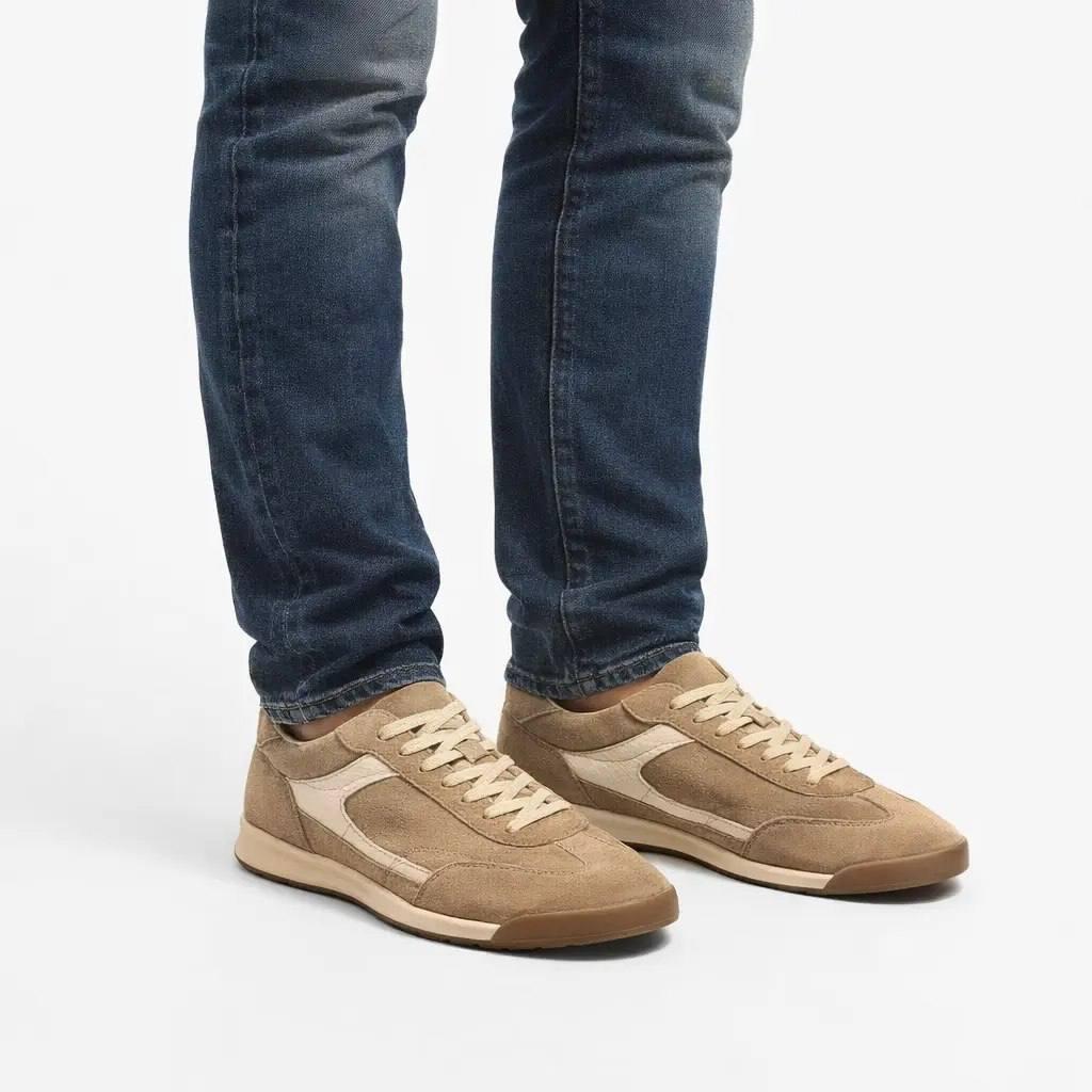 Sneakers in camoscio sabbia con dettagli in pelle bianca. Design moderno e trendy ideali per gli outfit urbani. Sottopiede memory e suola in gomma flessibile bicolore