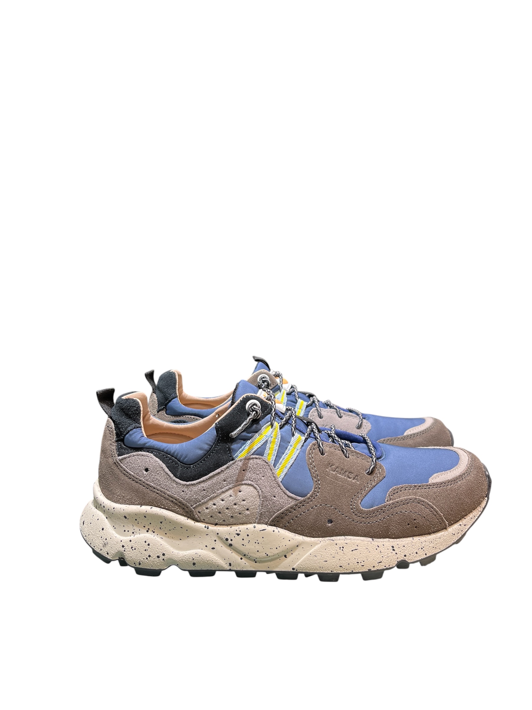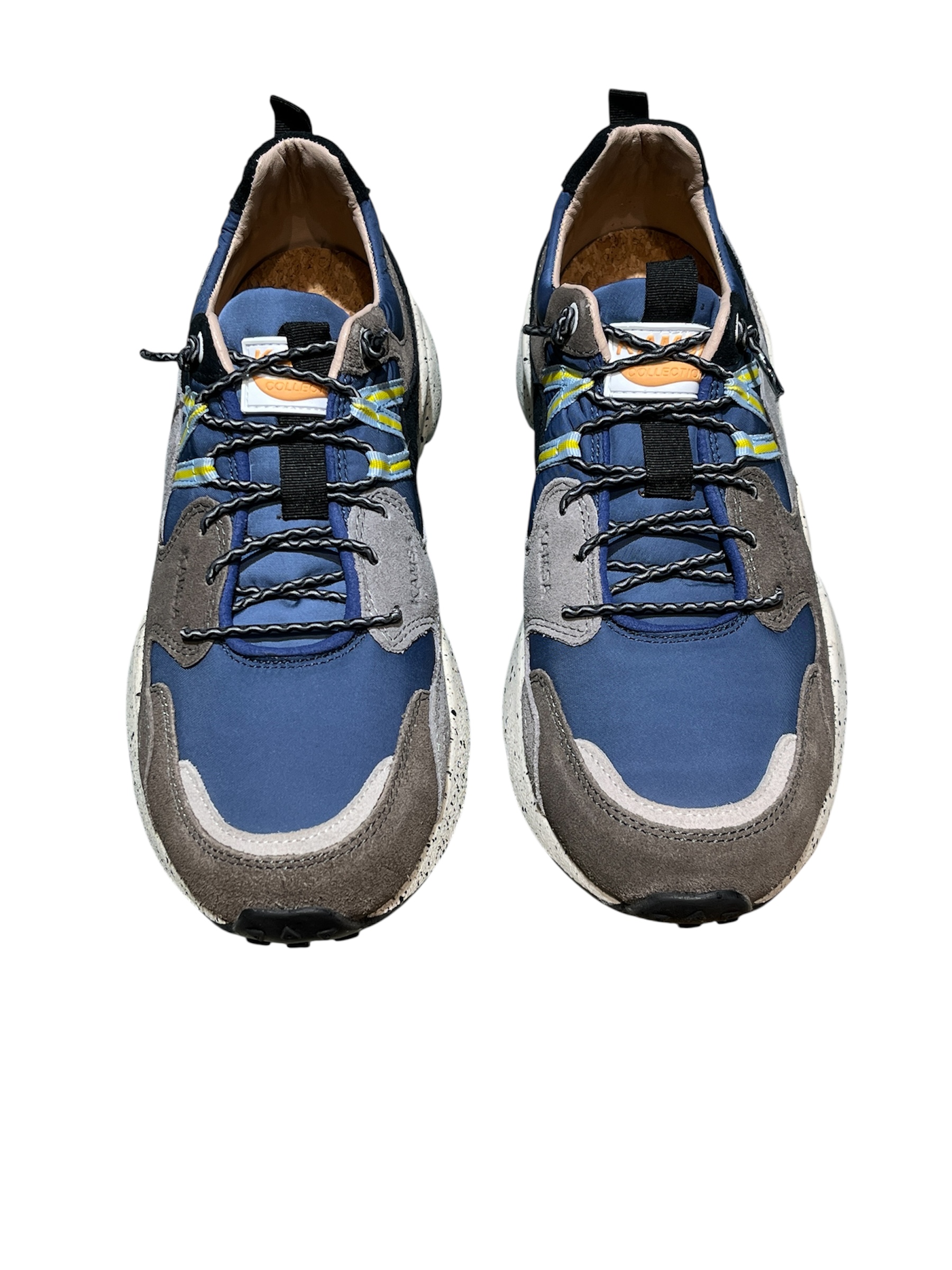 Sneakers uomo in camoscio e tessuto nelle tonalità del jeans. Suola in gomma tassellata con rialzo