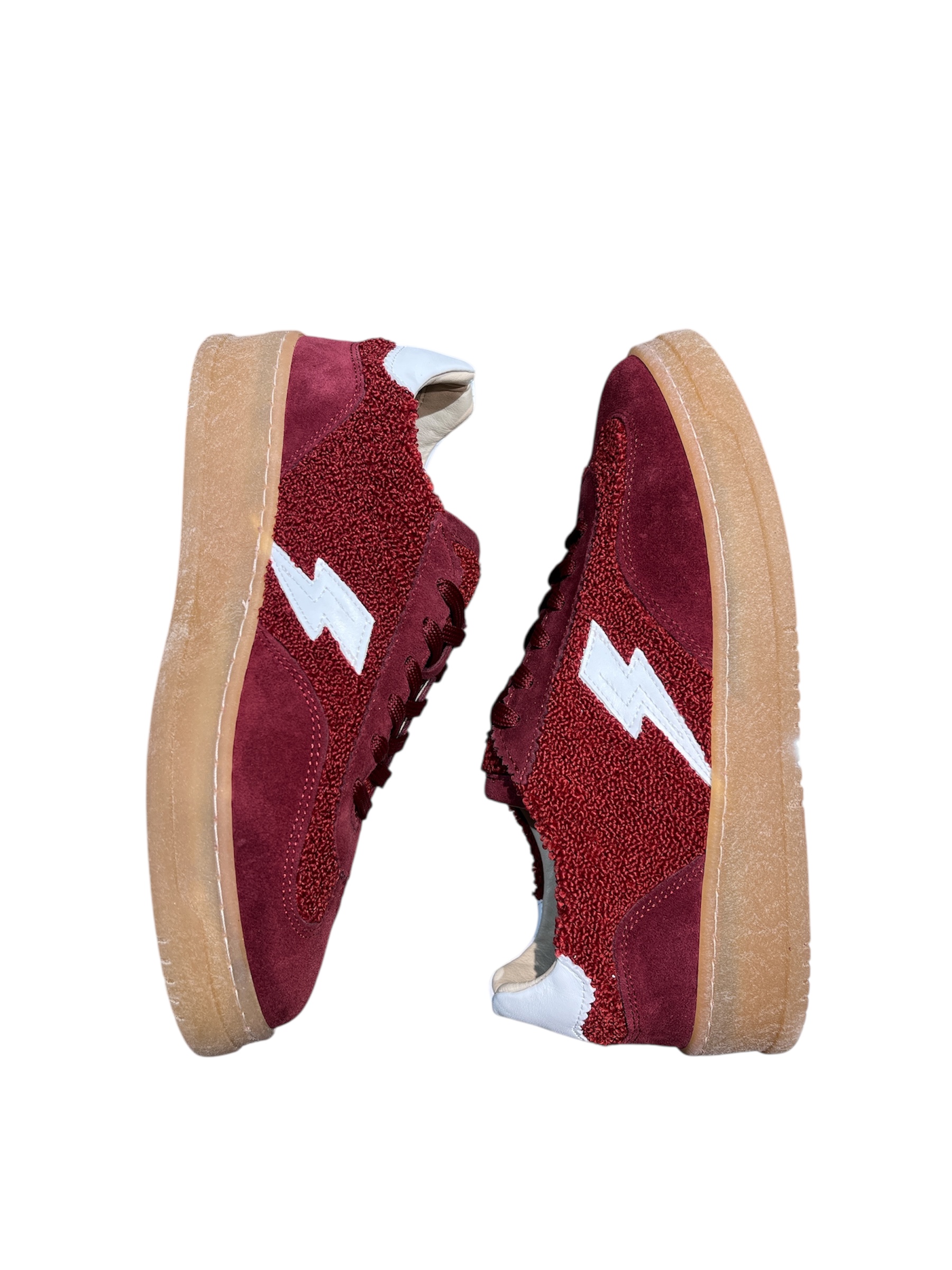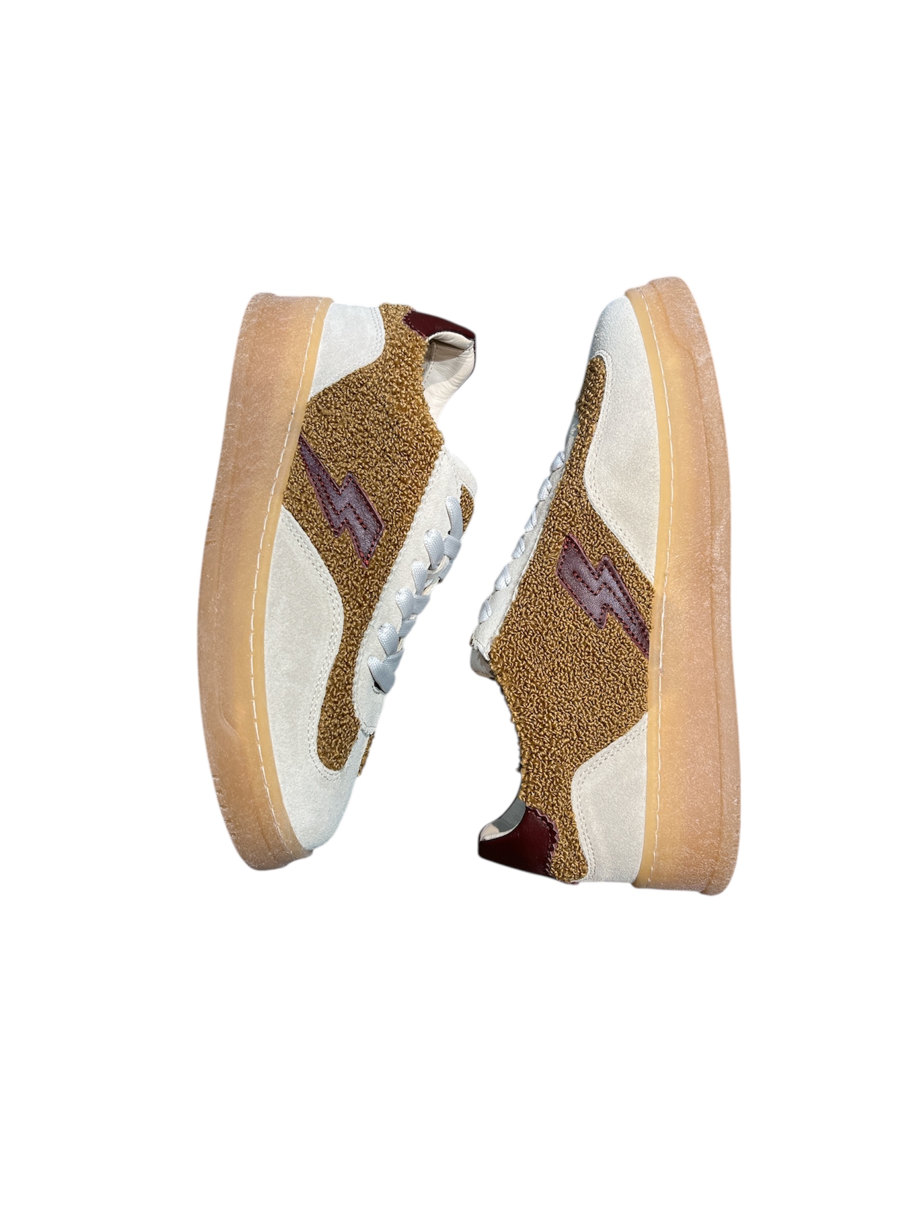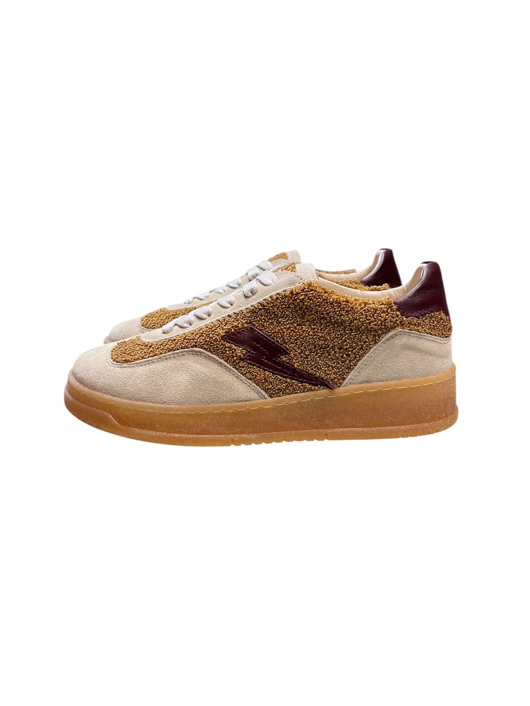 Sneakers donna in pelle e tessuto teddy. Plantare estraibile. Suola in gomma color miele
