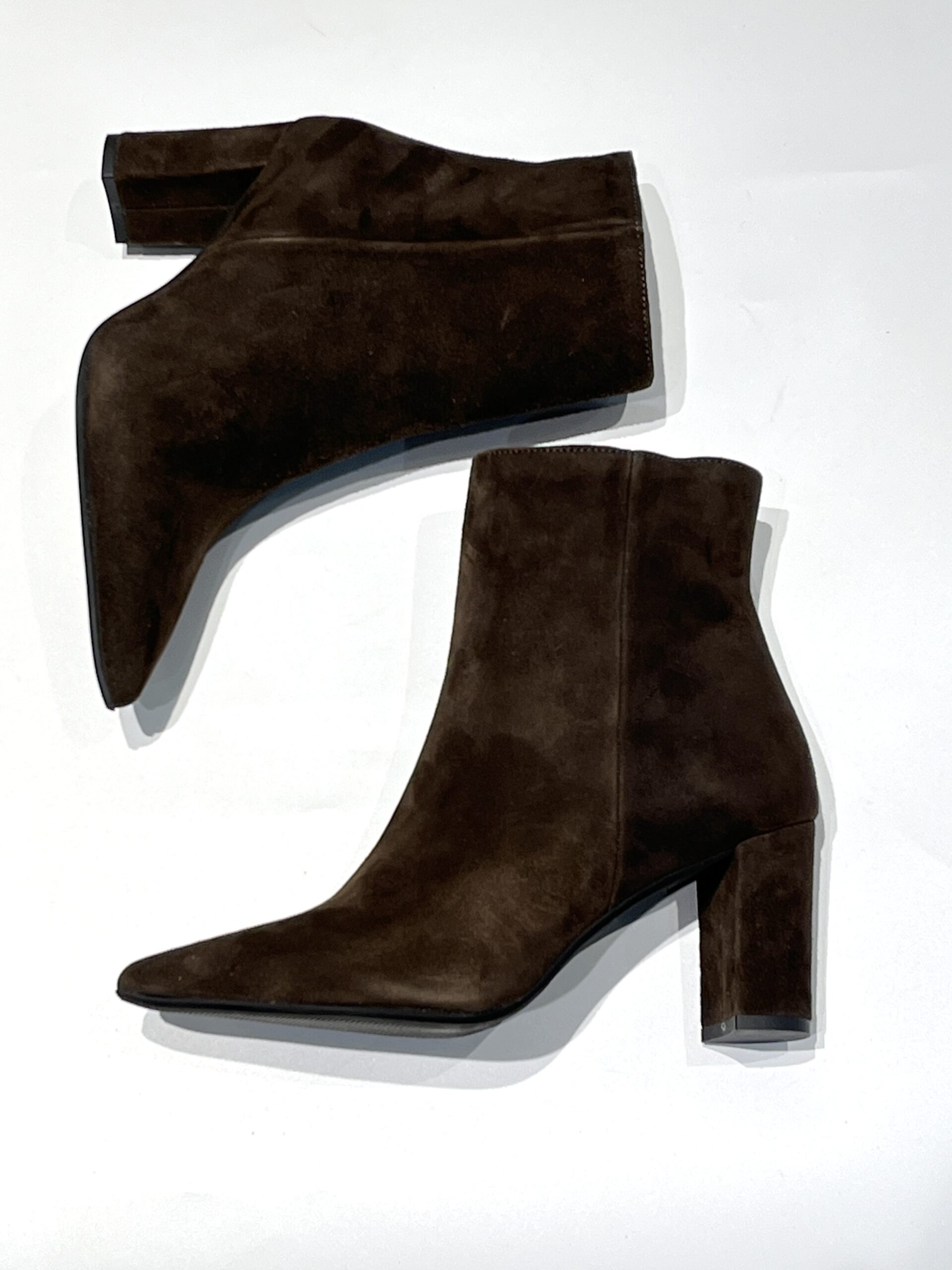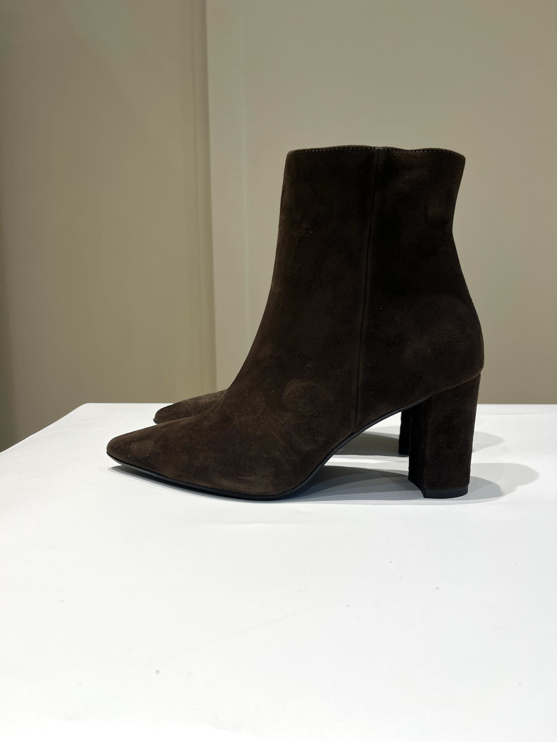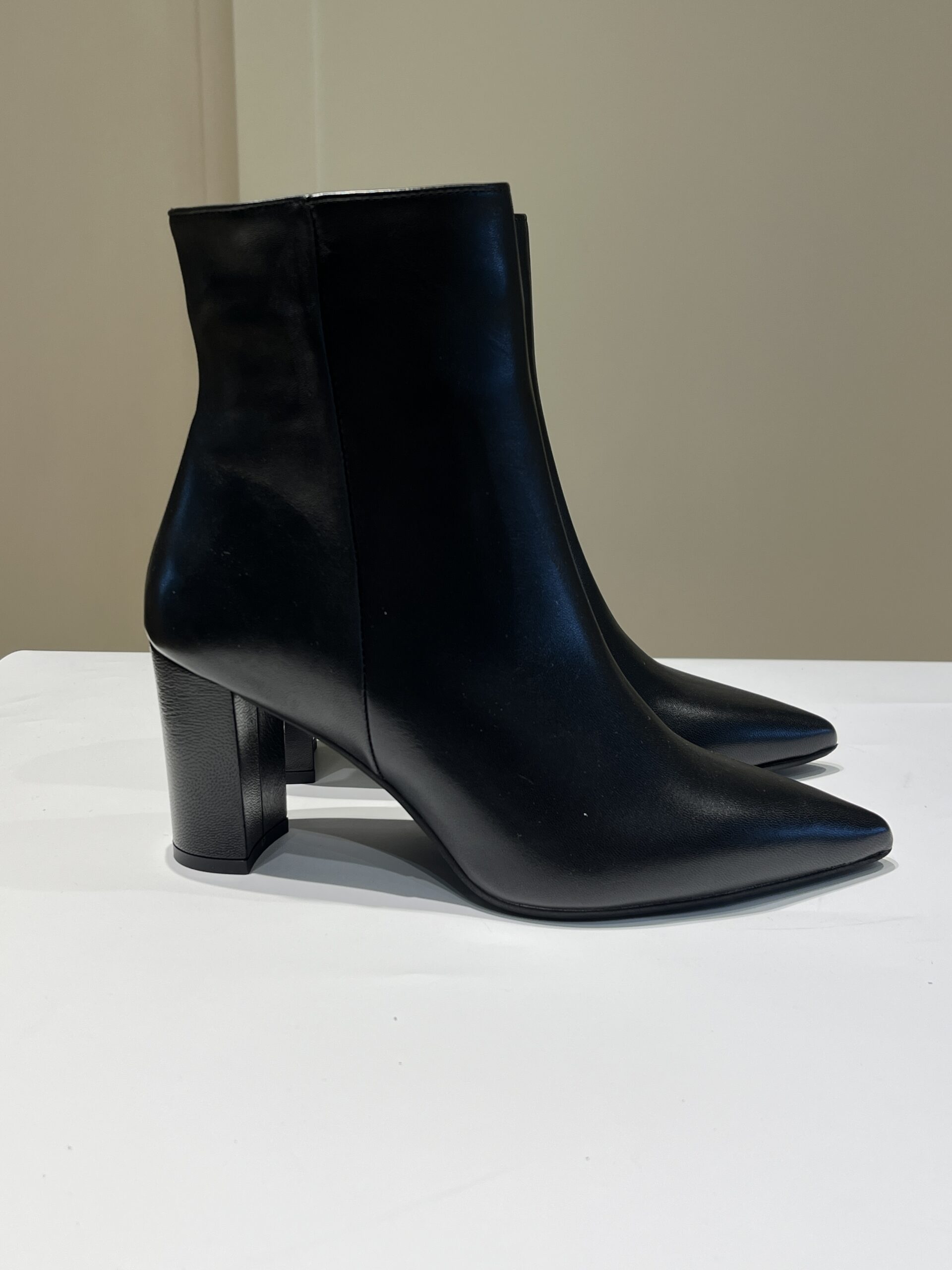 Tronchetto in pelle o camoscio forma sfilata con tacco 7 cm largo.