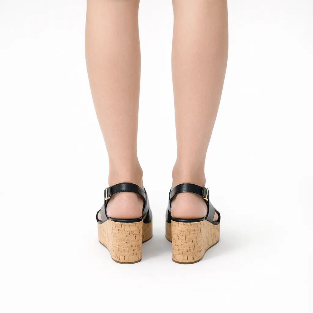 Sandalo in pelle nera con zeppa fasciata sughero, altezza 8 cm e plateau. Perfetta per tuti gli outfit casual
